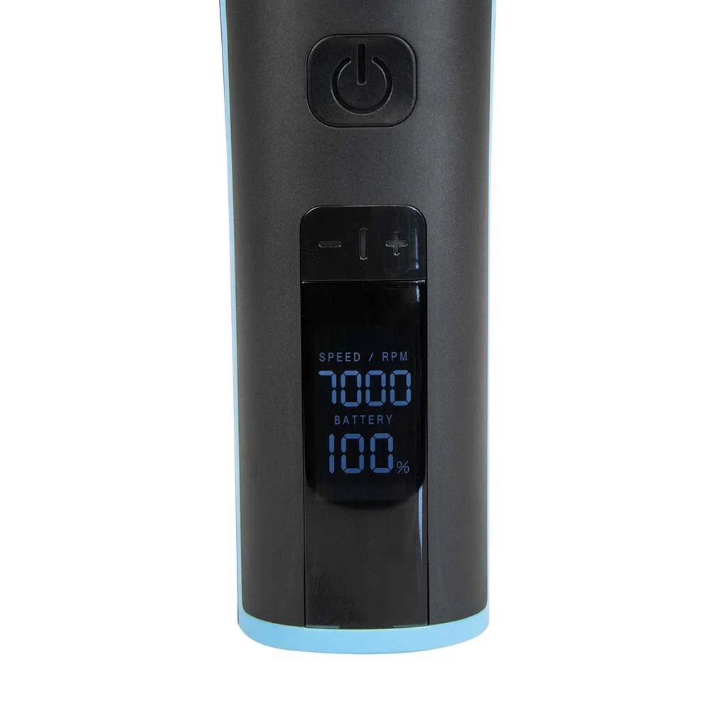 Krachtig professioneel hondenscheerapparaat voor gebruik thuis. Bijzonder licht en ergonomisch gevormd, ook voor langer, vermoeiender werk. Zeer stil en trillingsarm. Met hoogwaardige, duurzame merkbatterij (looptijd tot 8 uur). Met een gekleurd display (display opladen, batterijstatus, snelheidsniveau) en 4-voudig verstelbare 40 mm brede scheerkop (0,8 mm – 2,0 mm) met duurzaam titanium nano-keramisch bovenmes.