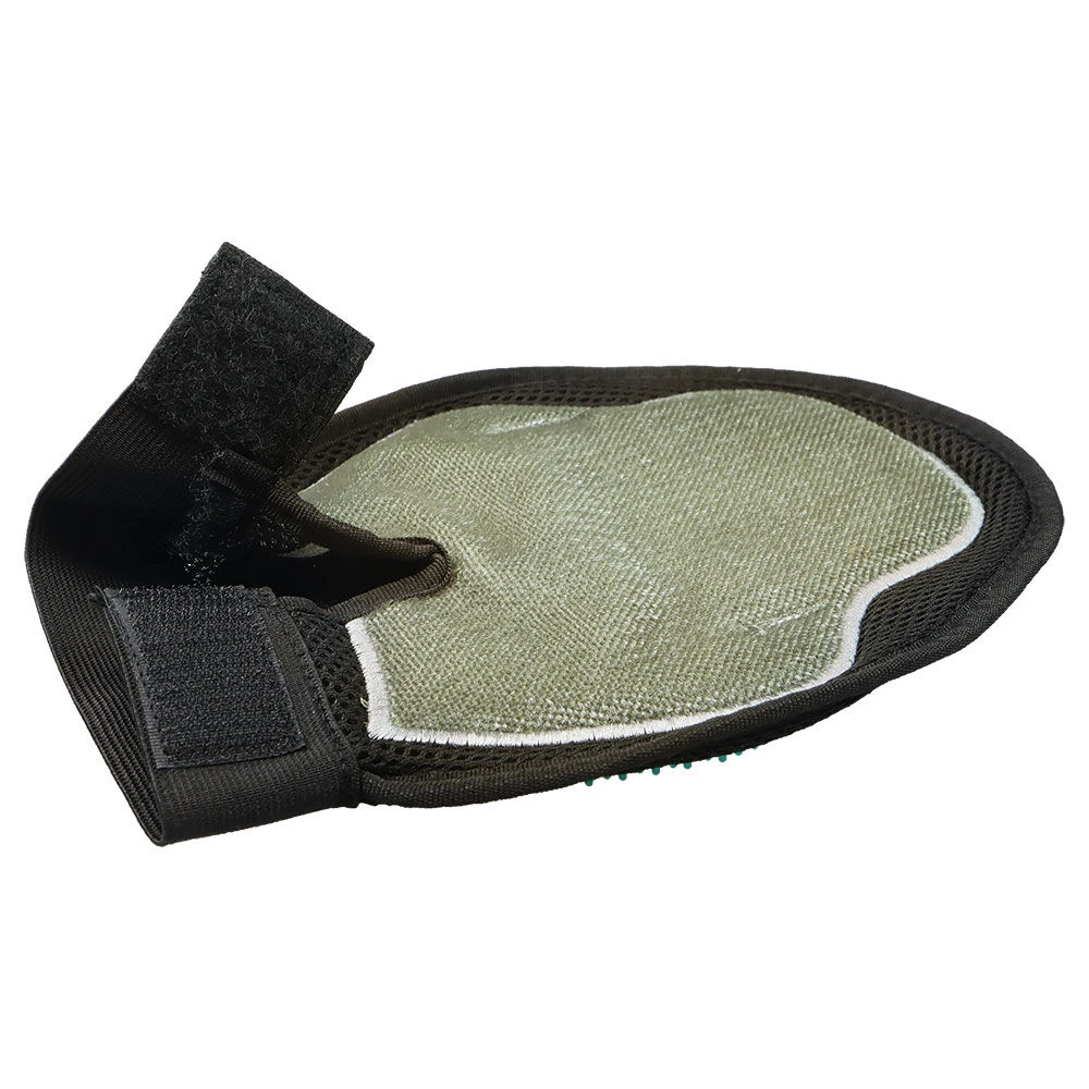 Universele maat vachtverzorgingshandschoen die aan beide zijden gebruikt kan worden. Rechts of links te gebruiken. Een brede, soepele klittenbandstrook houdt de handschoen stevig op zijn plaats. Gebruik de grove noppenzijde om de vacht glad te kammen, losse haren te verwijderen en ook om de hond te aaien en te masseren. Uw hond zal dit soort verzorging heerlijk vinden! En het versterkt ook de band tussen hond en mens. De fijne microvezelzijde van de handschoen wordt gebruikt om fijne, losse haren uit de vacht te verwijderen en ze stevig vast te houden. U kunt deze kant vooral op de kop van de hond gebruiken.