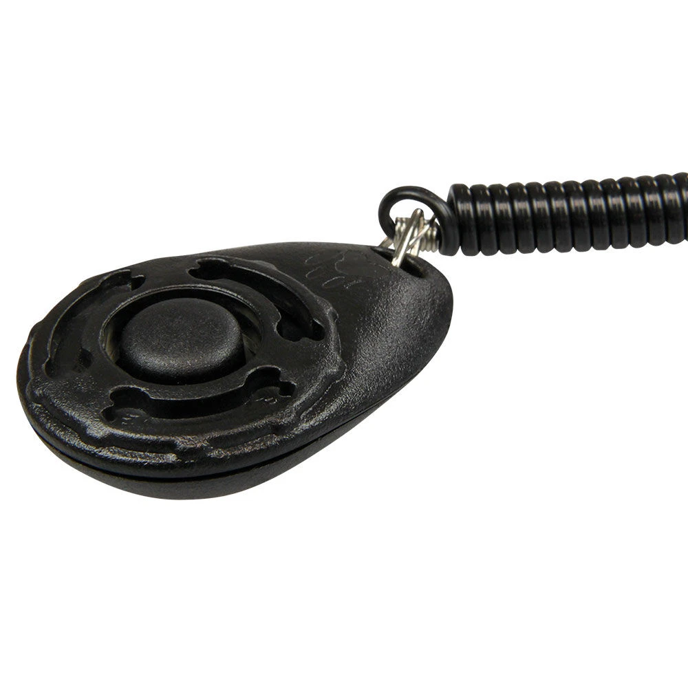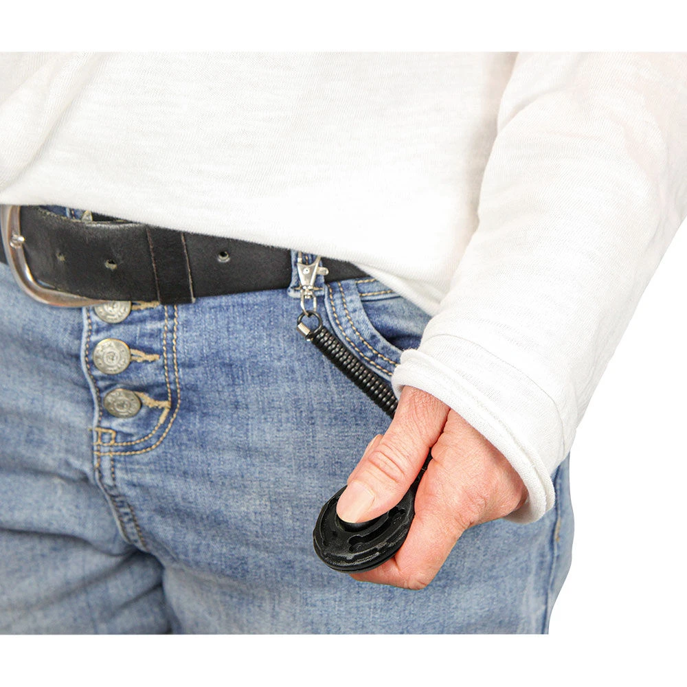 Handzame, luide clicker met een handige haak om de clicker vast te maken en met een flexibel spiraalsnoer. Zo heeft u de clicker altijd bij de hand en kunt u hem niet verliezen.