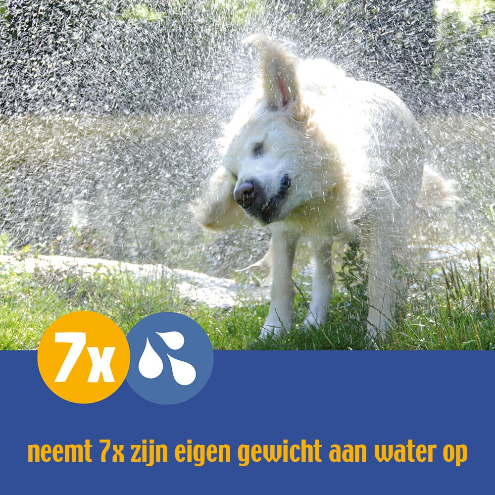 Speciale hondenhanddoek in de vorm van een lange sjaal. Daardoor goed vast te houden tijdens het drogen. Het microfiber-chenille materiaal neemt 7x zijn eigen gewicht aan water op en daarmee 5x meer dan gewone katoenen handdoeken.