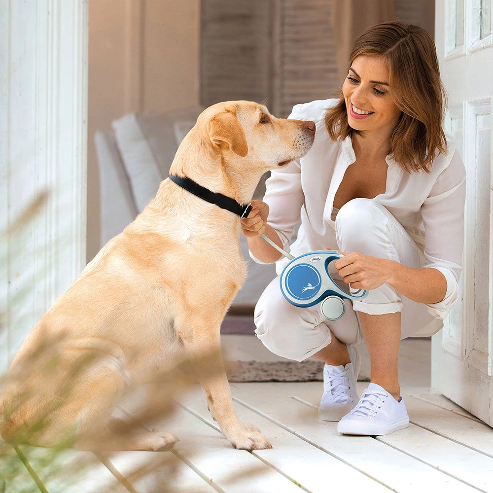 Flexi® geeft honden de grootst mogelijke vrijheid en hondengeleiders meer mobiliteit. De hond beweegt zich vrij, maar in elke situatie kan de uitlaat worden gestopt met een lichte druk op de rem. Dit beperkt de hond niet en is ook niet vermoeiend voor de eigenaar. Wil of moet de hondenbezitter zijn hond voor langere tijd “aan de voet” uitlaten – geen probleem met flexi®. Wanneer de lijn wordt afgeremd, wordt de permanente stop eenvoudig ingevoegd.