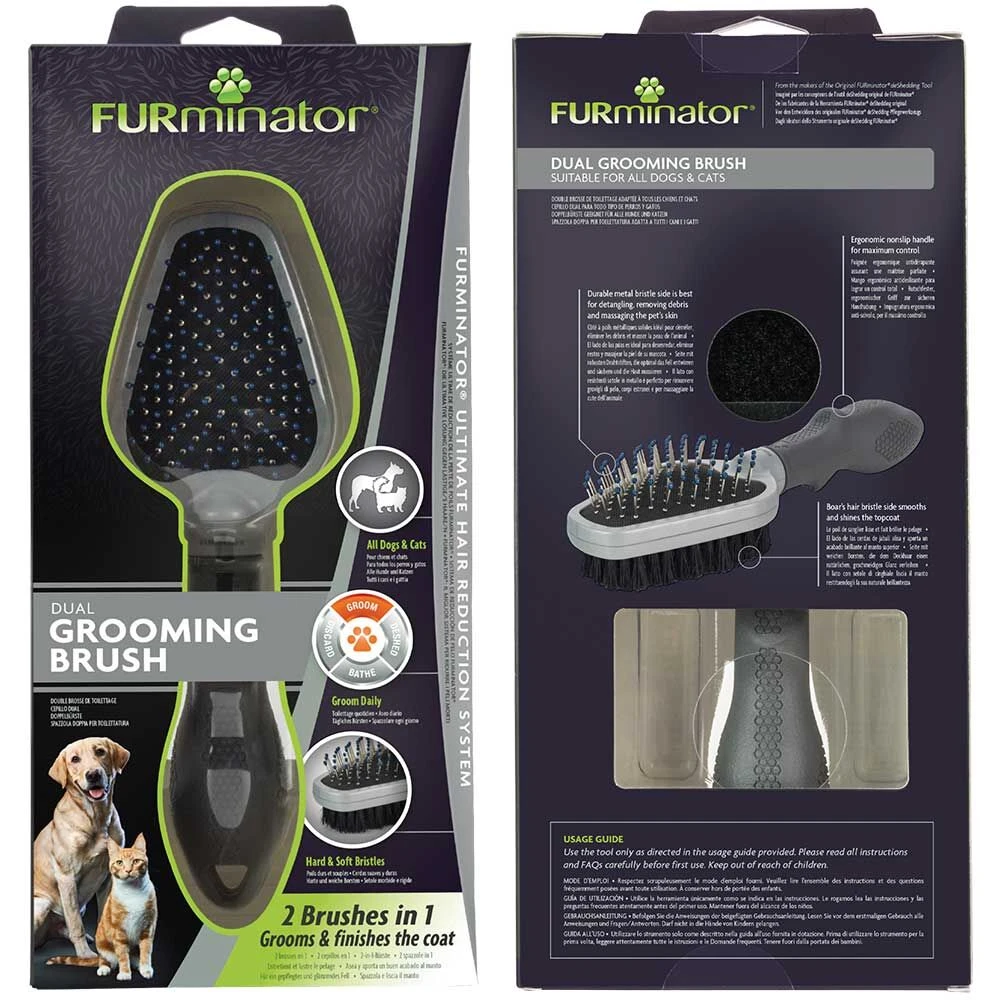 De FURminator dubbele borstel is een 2-in-1 vacht- en huidverzorgingsborstel. Voor het verwijderen van klitten, knopen, losse haren en vuil. De beide kanten van de borstel (botte pinnetjes en borstel) vullen elkaar daarbij optimaal aan. De hondenvacht wordt glad en goed verzorgd zonder te trekken of kans op huidirritatie