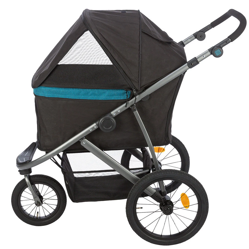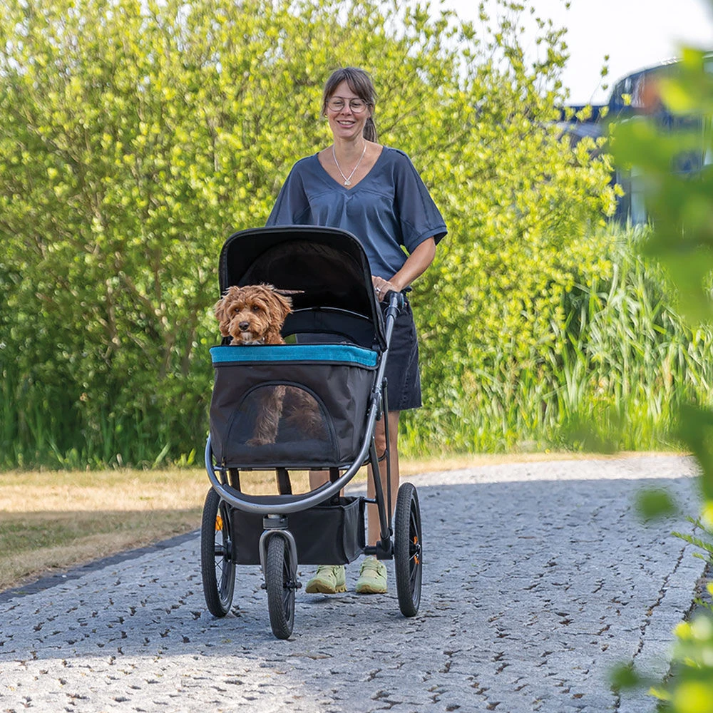 De dikke, met lucht gevulde banden zorgen voor een hoog rijcomfort. Door de grote achterklep kan uw hond gemakkelijk in- en uitstappen. De buggy is zeer wendbaar dankzij het afneembare voorwiel met 360°-scharnier. Als alternatief kan het voorwiel ook in de rechtuitstand worden vergrendeld (joggerfunctie). De buggy is ook voorzien van een parkeerrem, een geïntegreerde korte riem, diverse mesh-inzetstukken, een uitneembaar kussen, een verdikte en in hoogte verstelbare handgreep en nog veel meer.