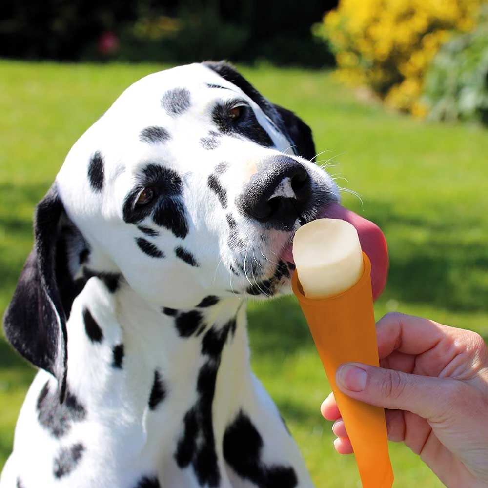 De verkoelende zomersnack. Steeds opnieuw te gebruiken, al voorgevuld voor het eerste gebruik. Gewoon vullen met water, een beetje schudden, invriezen en uw viervoeter kan genieten.