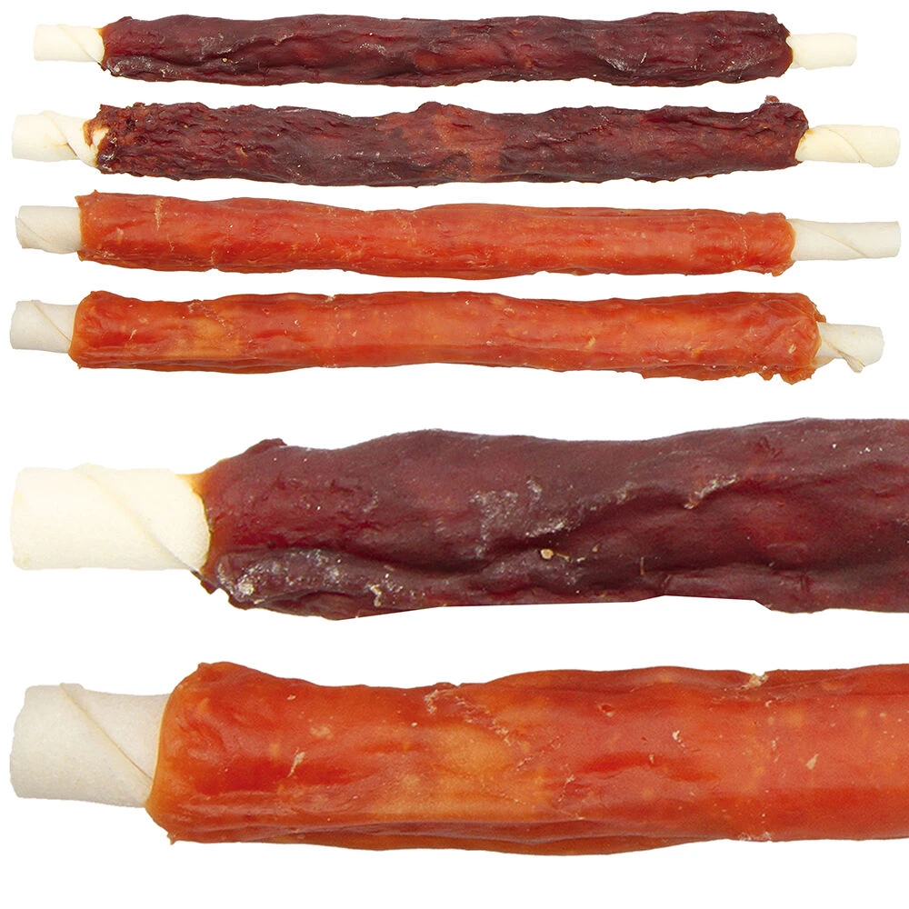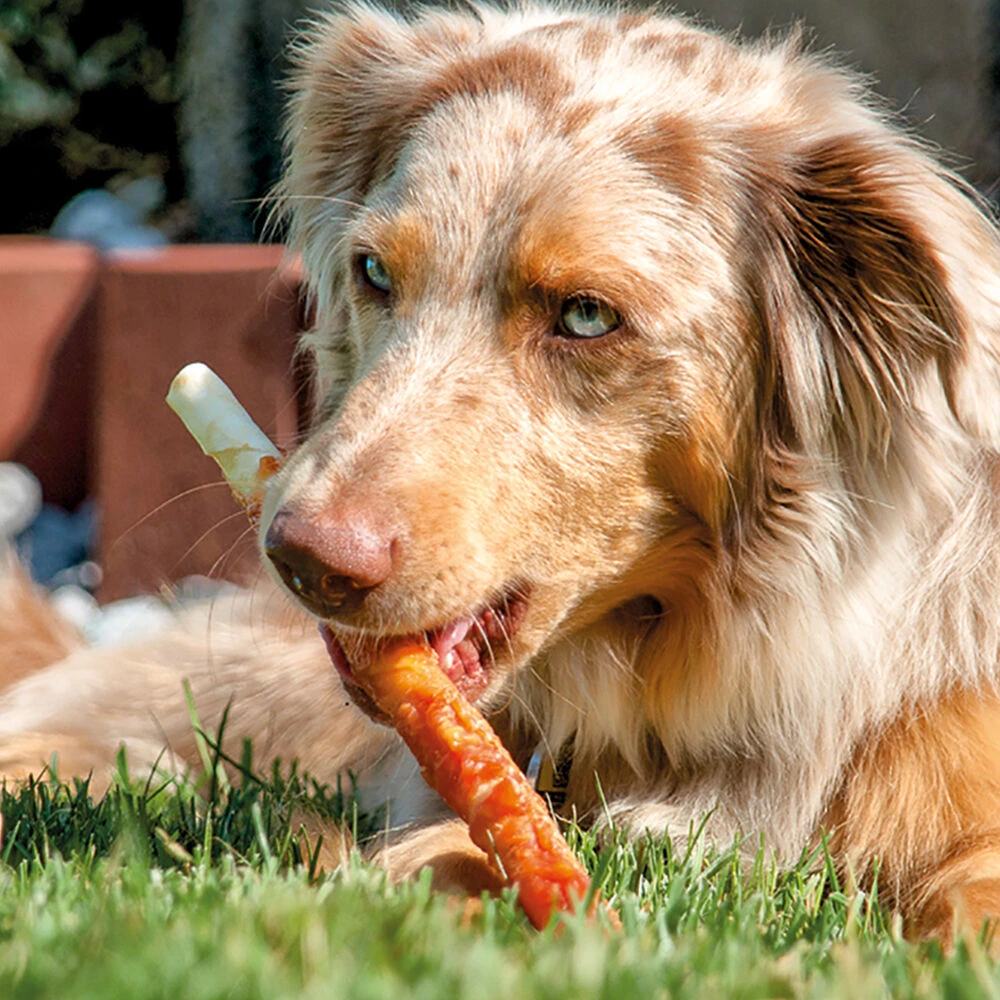 Grote, dikke kauwstaven van buffelhuid omwikkeld met veel filet. Een heerlijke kauwsnack voor middelgrote tot zeer grote honden.