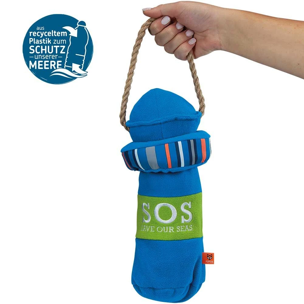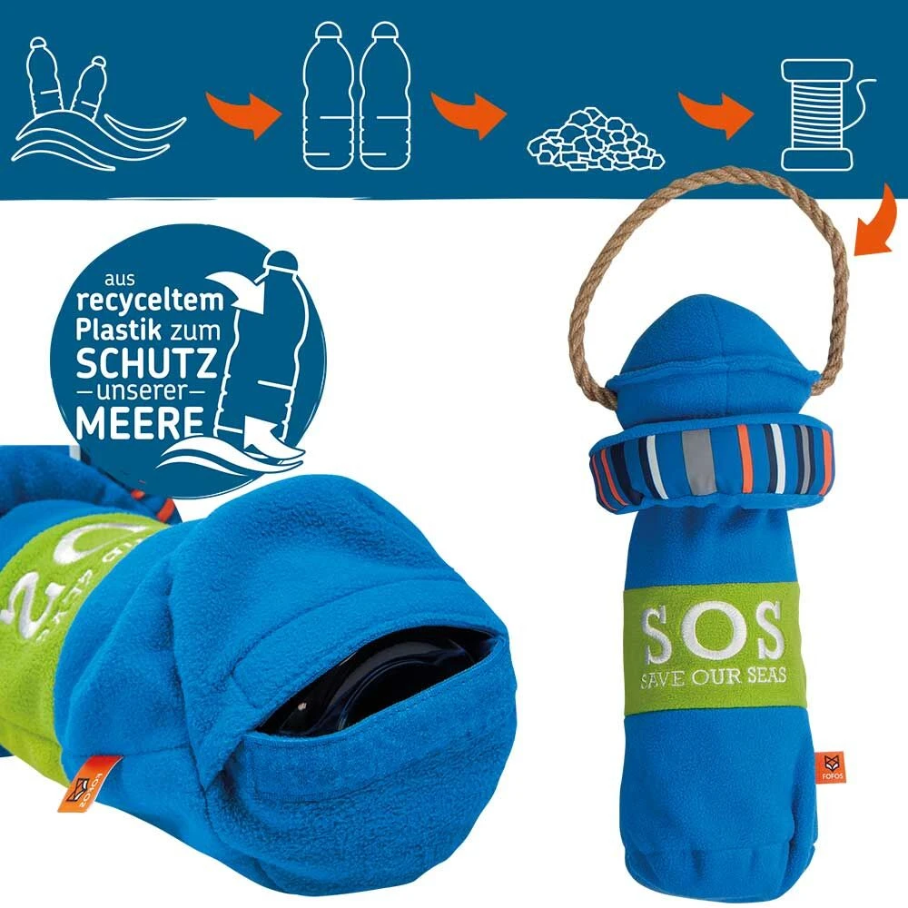 Een heel bijzonder speeltje in maritiem design. De bekleding bestaat uit voormalige, gerecyclede pet-flessen (RPET) die hiermee een ’tweede leven’ krijgen. Aan de binnenkant bevindt zich een lege pet-drinkfles die u telkens kunt vervangen. Op deze manier kunt u ook gebruikte pet-flessen recyclen! De flessen knisperen en kraken als de hond ze vastpakt, en dit kraakgeluid stimuleert de speelbehoefte.