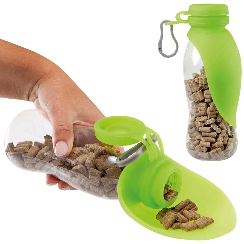 Praktische fles met siliconesluiting en geïntegreerde, opklapbare tuit. Door de 3 cm grote flesopening kan de fles worden gevuld met droogvoer, dat zo op elk moment gedoseerd en zonder aanraking op de zachte silicone-tuit kan worden geschud. Vervolgens is de tuit heel gemakkelijk weer in te klappen en kan de fles weer worden opgeborgen. Een ideale, ruimtebesparende voeroplossing voor onderweg. En de handen blijven schoon! Met karabijnhaak.