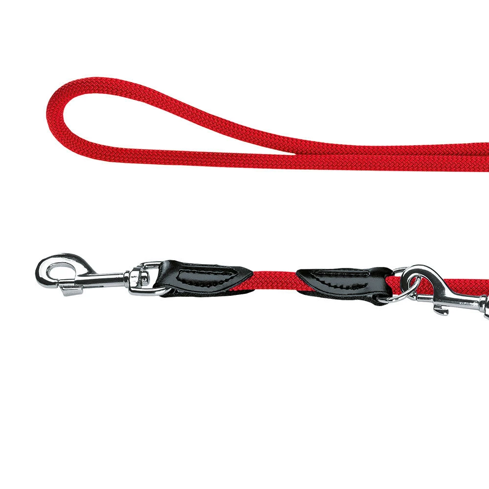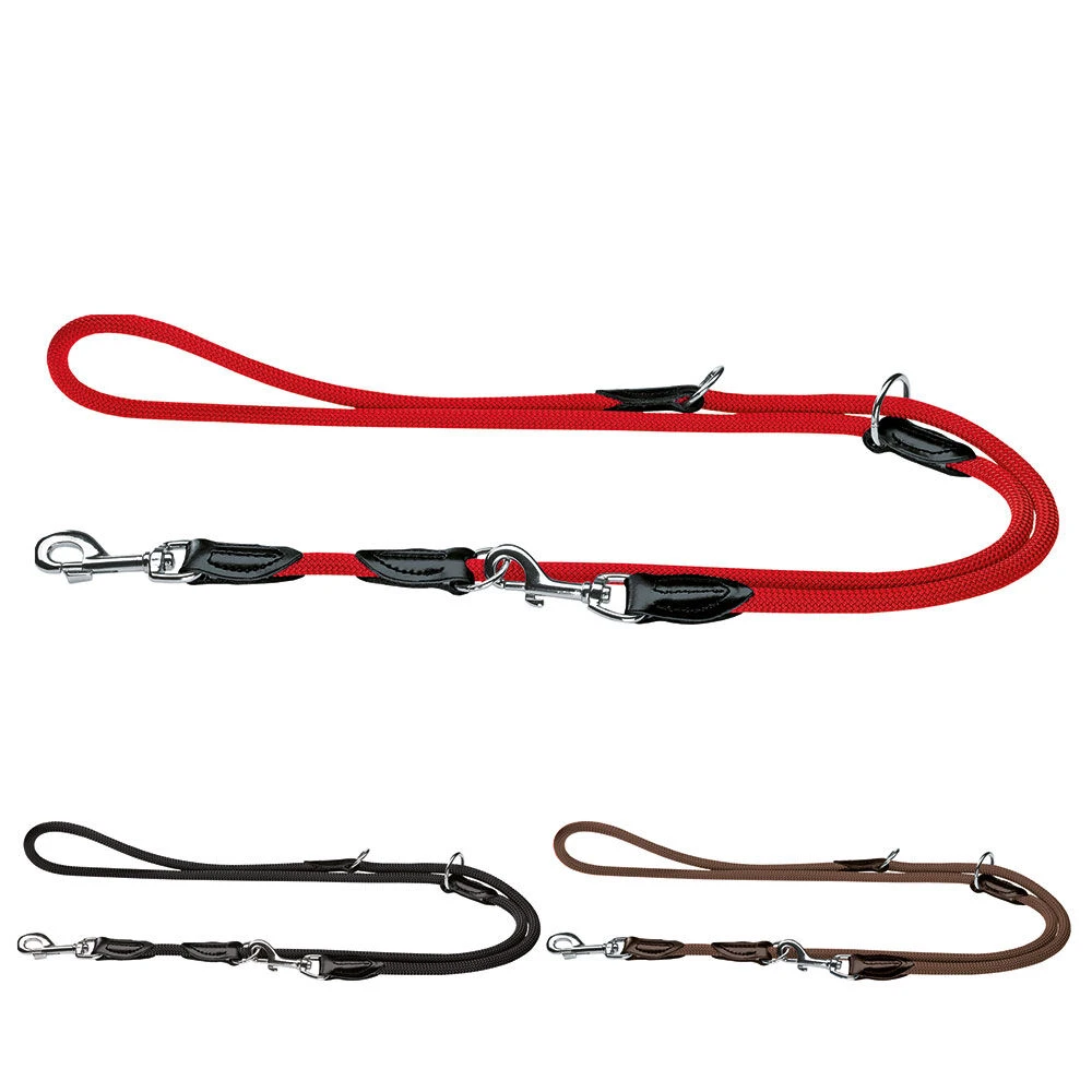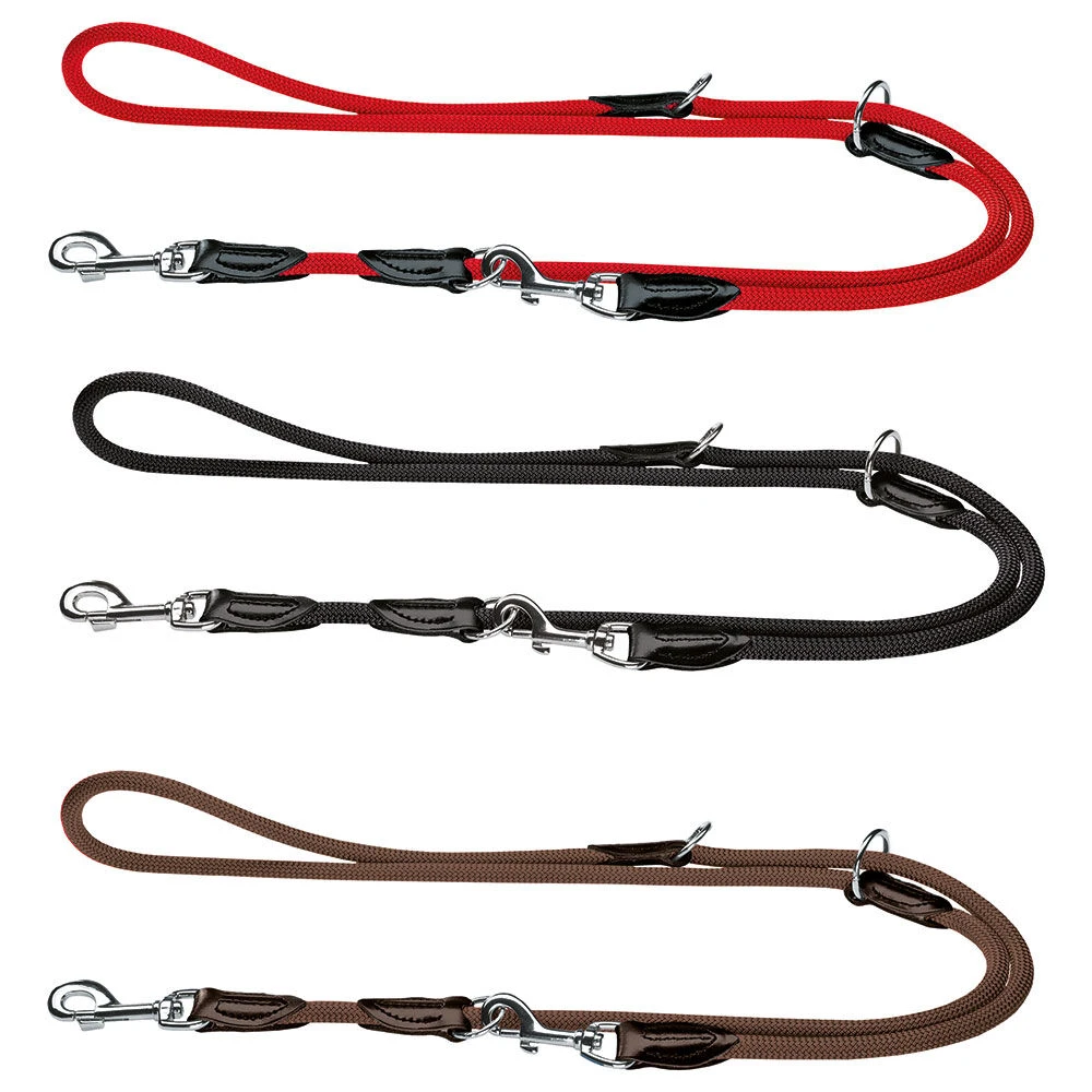 Verlenglijn 2 m, 3-voudig verstelbaar, nylon met gestikte leren afwerking en karabijnhaken.
