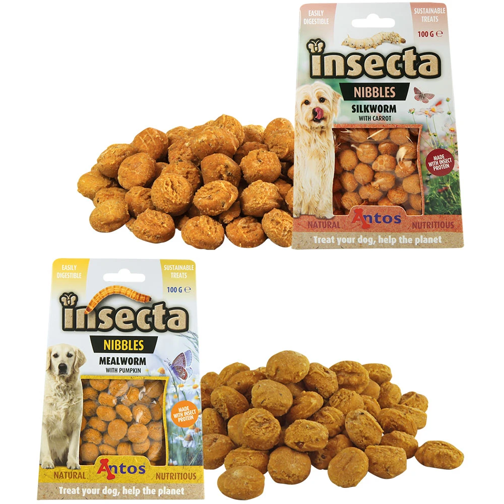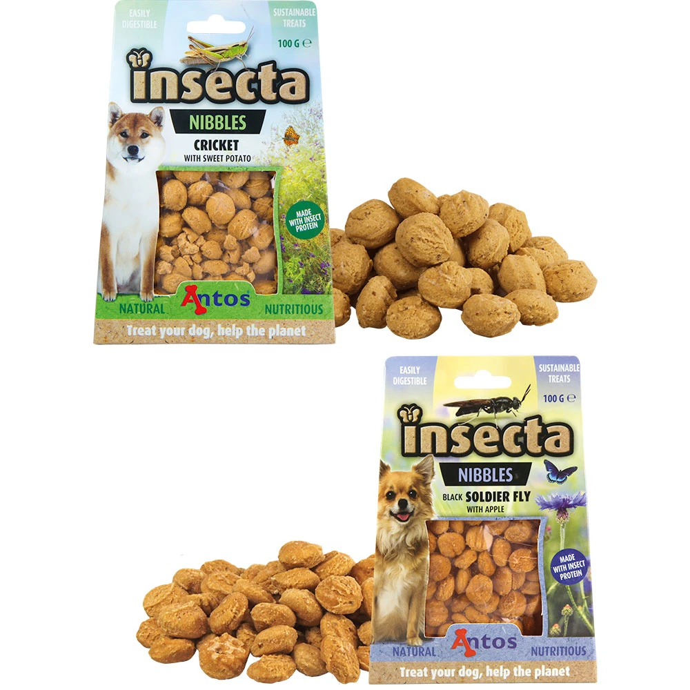 Insecteneiwit is een milieuvriendelijker, duurzamer alternatief voor conventionele snacks. Ook bevelen steeds meer dierenartsen eiwitten uit insecten aan voor honden met voedselintoleranties, huidaandoeningen en een gevoelige maag.