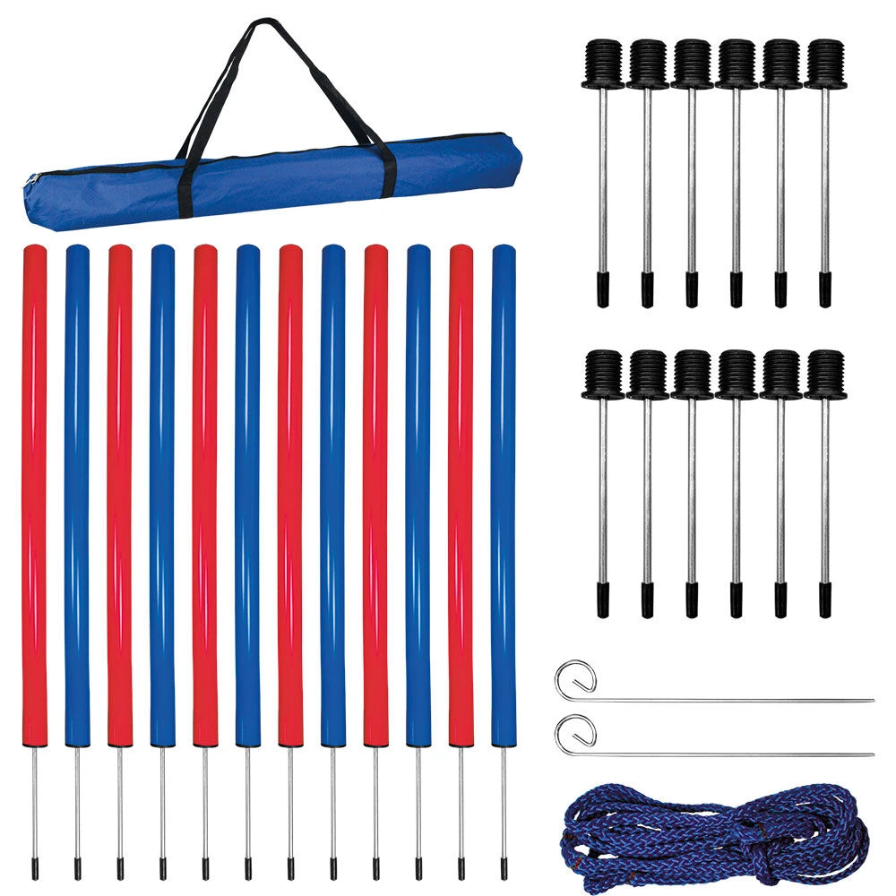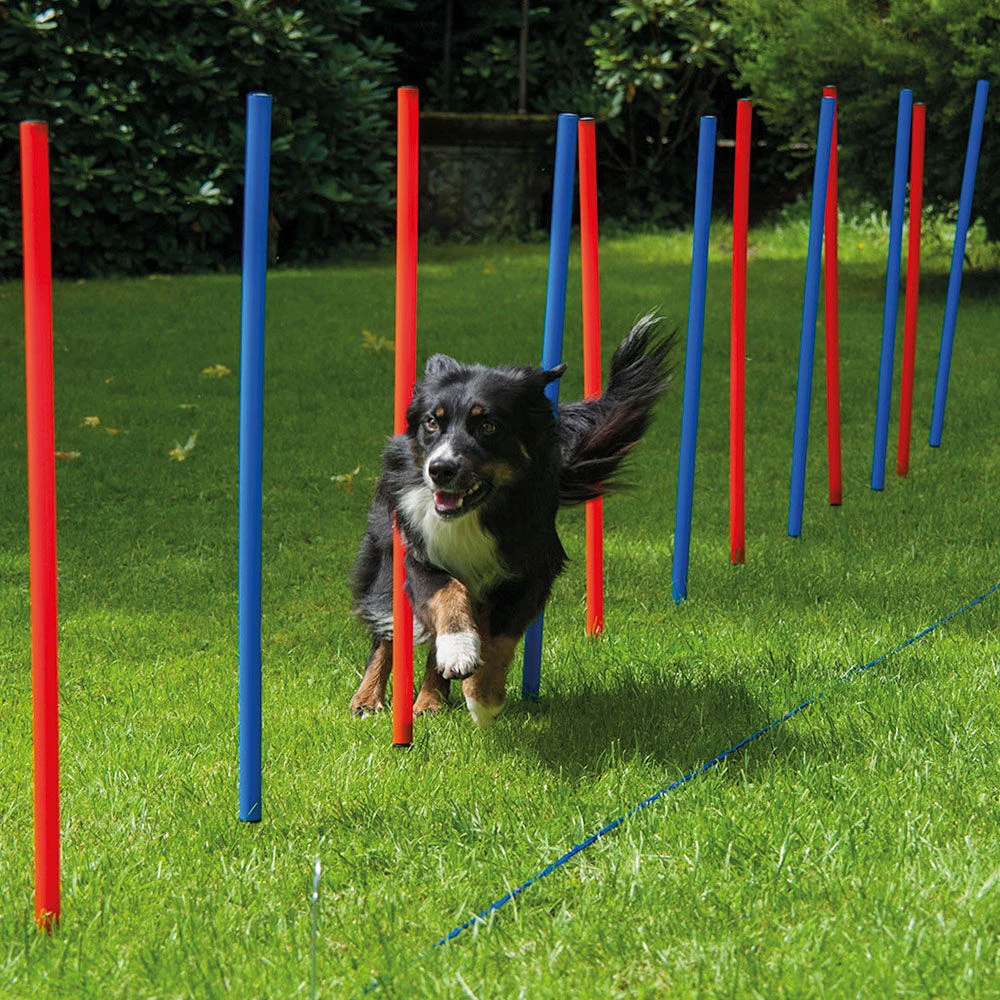 Deze 12 leuke slalompaaltjes zorgen voor afwisseling in de dagelijkse routine van uw hond. Een fitnessprogramma voor uw viervoeter dat leuk is en hem bovendien gezond en fit houdt. Spelplezier voor mens en dier! De slalompaaltjes kunnen gewoon met haringen in de grond vast worden gezet!