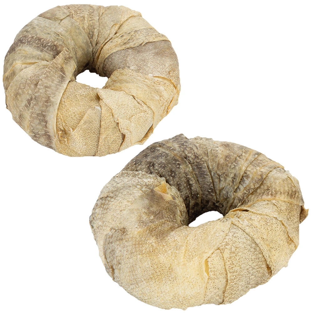 Dikke ringen van runderhuid, omwikkeld met heerlijke vissenhuid. Deze snack is zeer geliefd bij honden! Met smaak zal uw hond eerst de vis van de ring knabbelen, om vervolgens lange tijd aan de dikke ring te gaan knagen. Een perfecte kauwsnack! Kies een afmeting die bij uw hond past.