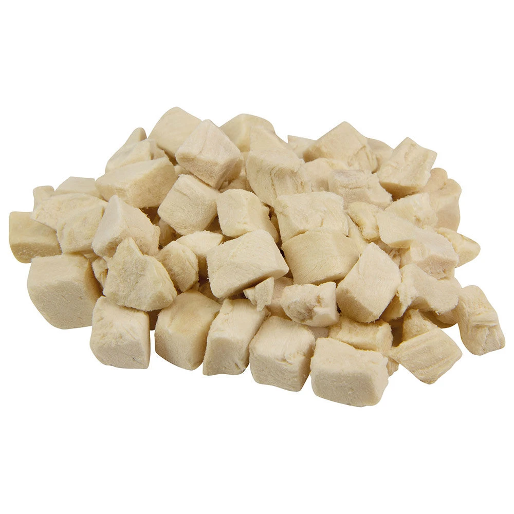 Pure gevriesdroogde (FD) kipblokjes zonder toevoegingen. Het vriesvacuümdroogproces is waarschijnlijk het mildste droogproces van allemaal. Deze dobbelsteentjes zijn superlicht en zacht, waardoor ze ideaal zijn voor oudere honden en honden die niet op harde voorwerpen mogen kauwen. Maar ze zijn ook gewoon geschikt als een lekkere snack voor alle honden. Van puur kippenborstvlees.