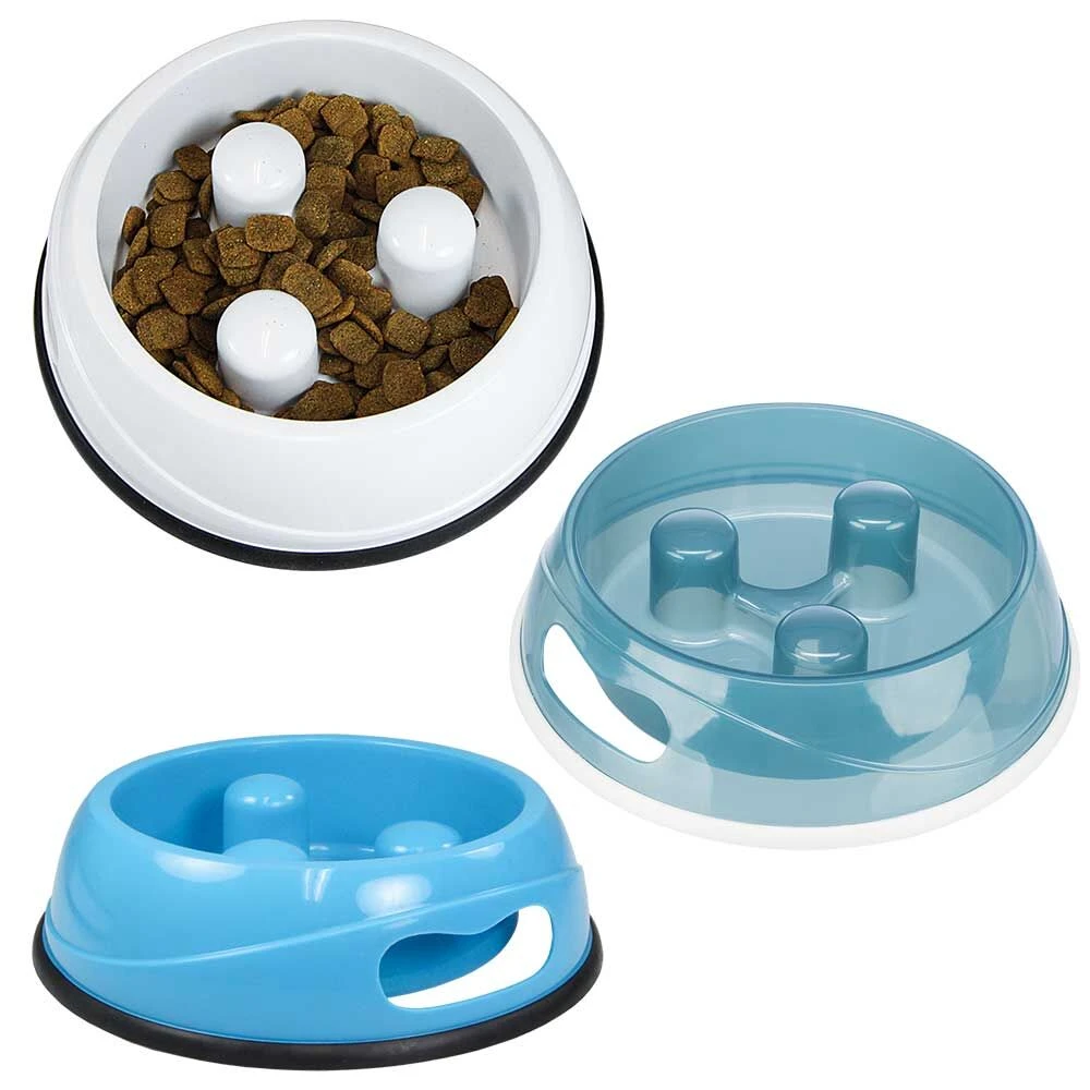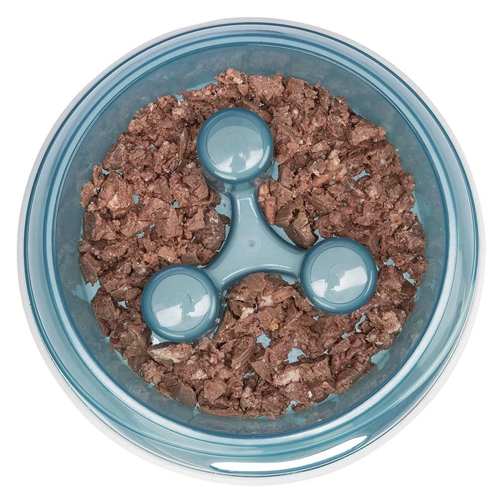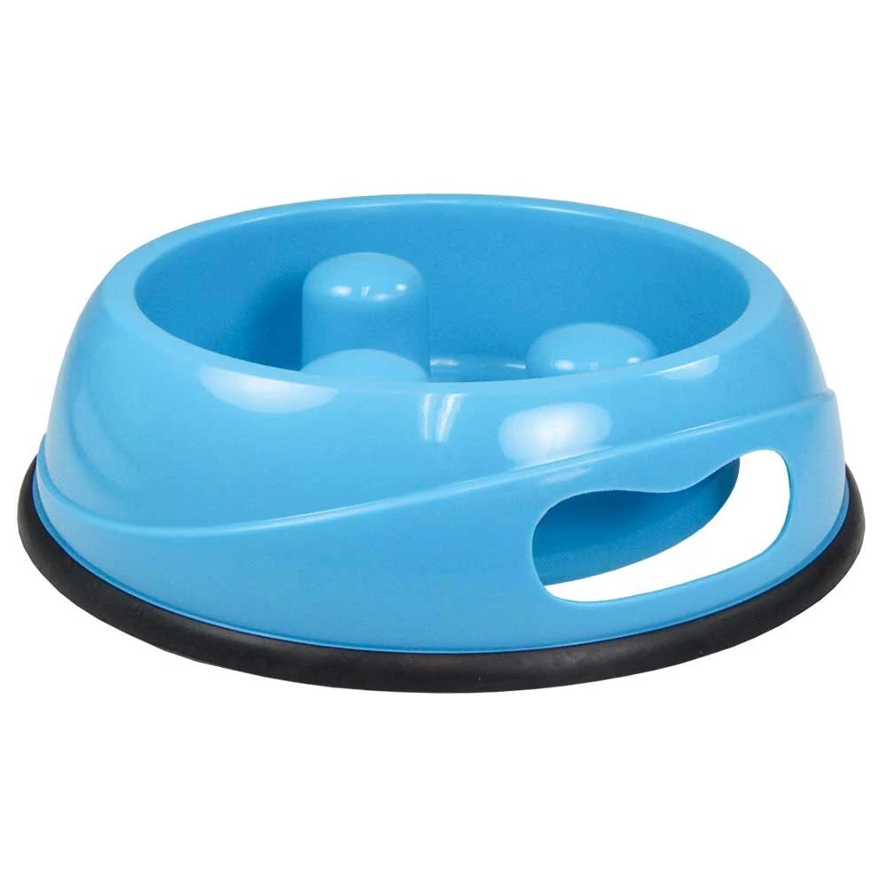 Hondenbak met 3 pylonnen in verschillende hoogten binnenin. Bij de laagste pylon is het voer het eenvoudigst te bereiken. Deze bak zorgt ervoor dat uw hond langzamer eet en beschermt daardoor de maag. Ideaal voor honden die schrokken en om maagproblemen door te haastig eten te voorkomen.