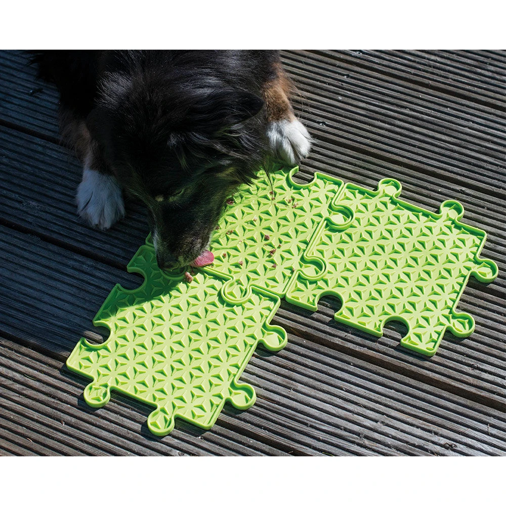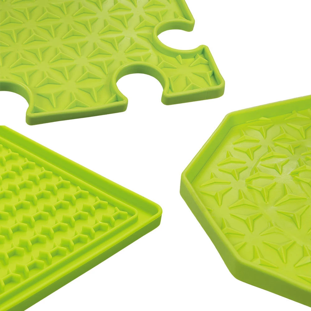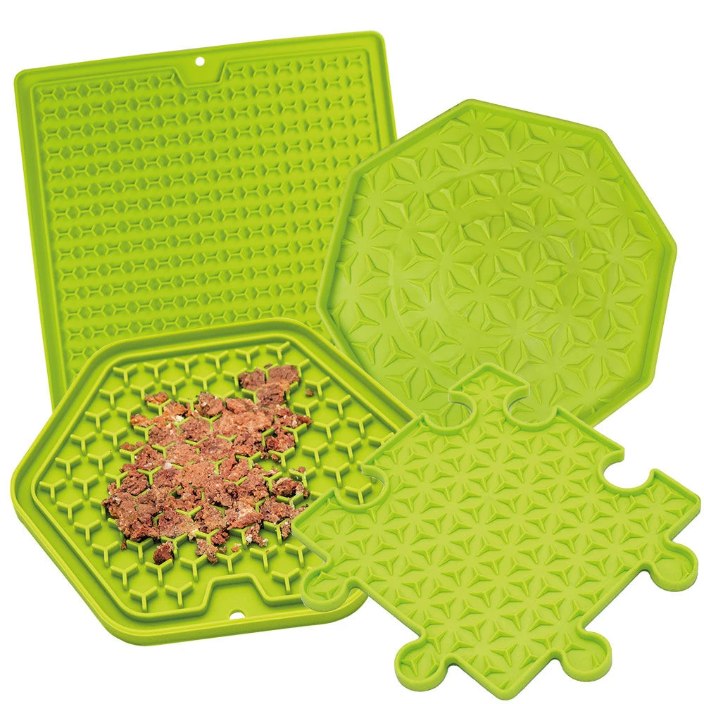 - “Puzzel”, 22×22 cm: Likmatten zijn geschikt voor hondenleverworst, voor natvoer, voor smoothies en vele andere lekkernijen. Verdeel de traktatie eenvoudig zo breed mogelijk en uw kleintje zal lang plezier en activiteit hebben. Deze legpuzzelmatten kunnen naar behoefte afzonderlijk worden gebruikt of worden samengevoegd om er meerdere te vormen. Op deze manier kunnen echt grote likvlakken, zelfs voor meerdere honden, worden bereikt. De matten zijn voedselveilig, vaatwasmachinebestendig en vorstbestendig. Met antislip onderkant.