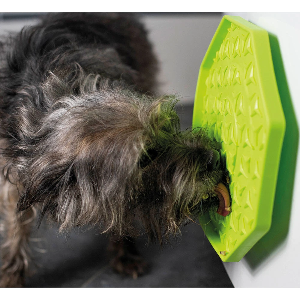 De opvolger van de bekende likmat. Leg gewoon wat hondenleverworst, yoghurt, smeerkaas of een andere lekkernij op de mat en laat de hond eraan likken. Een heerlijk tijdverdrijf waar uw trouwe viervoeter veel plezier aan zal beleven! Gemaakt van hygiënisch siliconenrubber, resistent, vaatwasmachinebestendig en duurzaam.