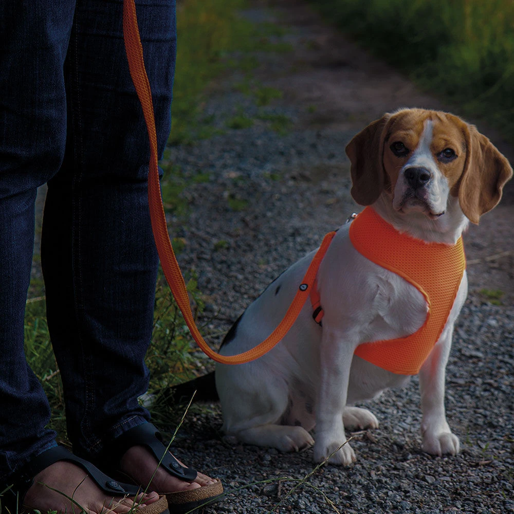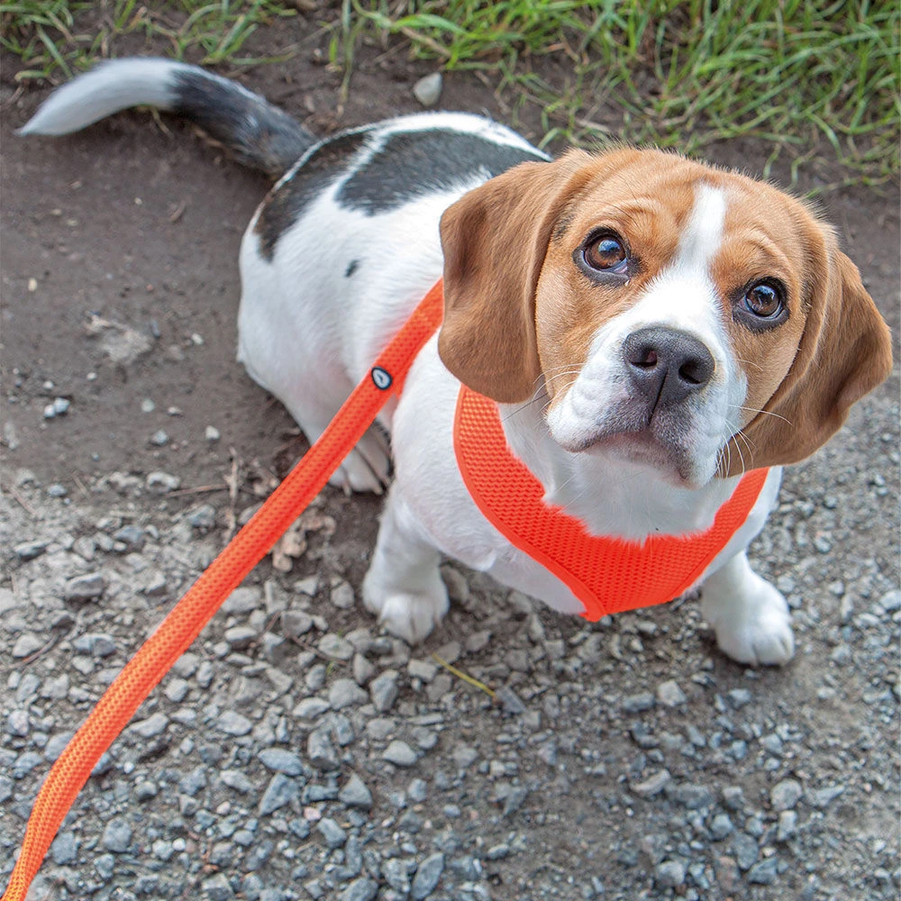 Hondentuigje van mesh voor kleine tot middelgrote honden. Van zeer lichte, felgekleurde, luchtige netstof. Water- en vochtdoorlatend, sneldrogend en wasbaar. Een ideaal hondentuigje voor in de schemering of in het donker. Door het hoge draagcomfort ook ideaal voor honden met huidirritaties of honden die niet graag de conventionele tuigjes dragen. Voor de juiste maat moet de kop door het voorste gat passen (kopomtrek meten), en moet de buikomtrek achter de borst (verstelbare buikriem) gemeten worden.