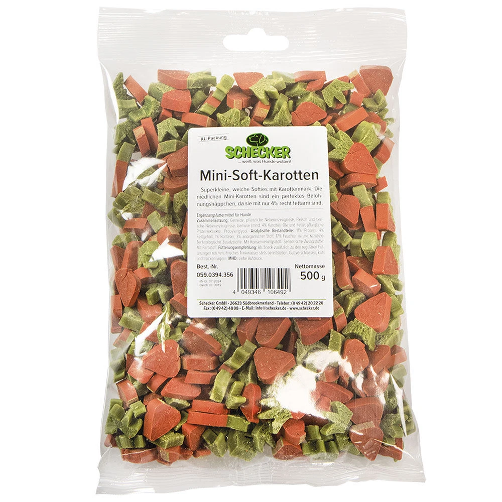 Superkleine, zachte soft-snacks met wortelpulp. Deze schattige worteltjes zijn een perfecte traktatie omdat ze relatief weinig vet bevatten (slechts 4%). De mini-wortels zijn ook perfect te gebruiken voor de hondentraining.