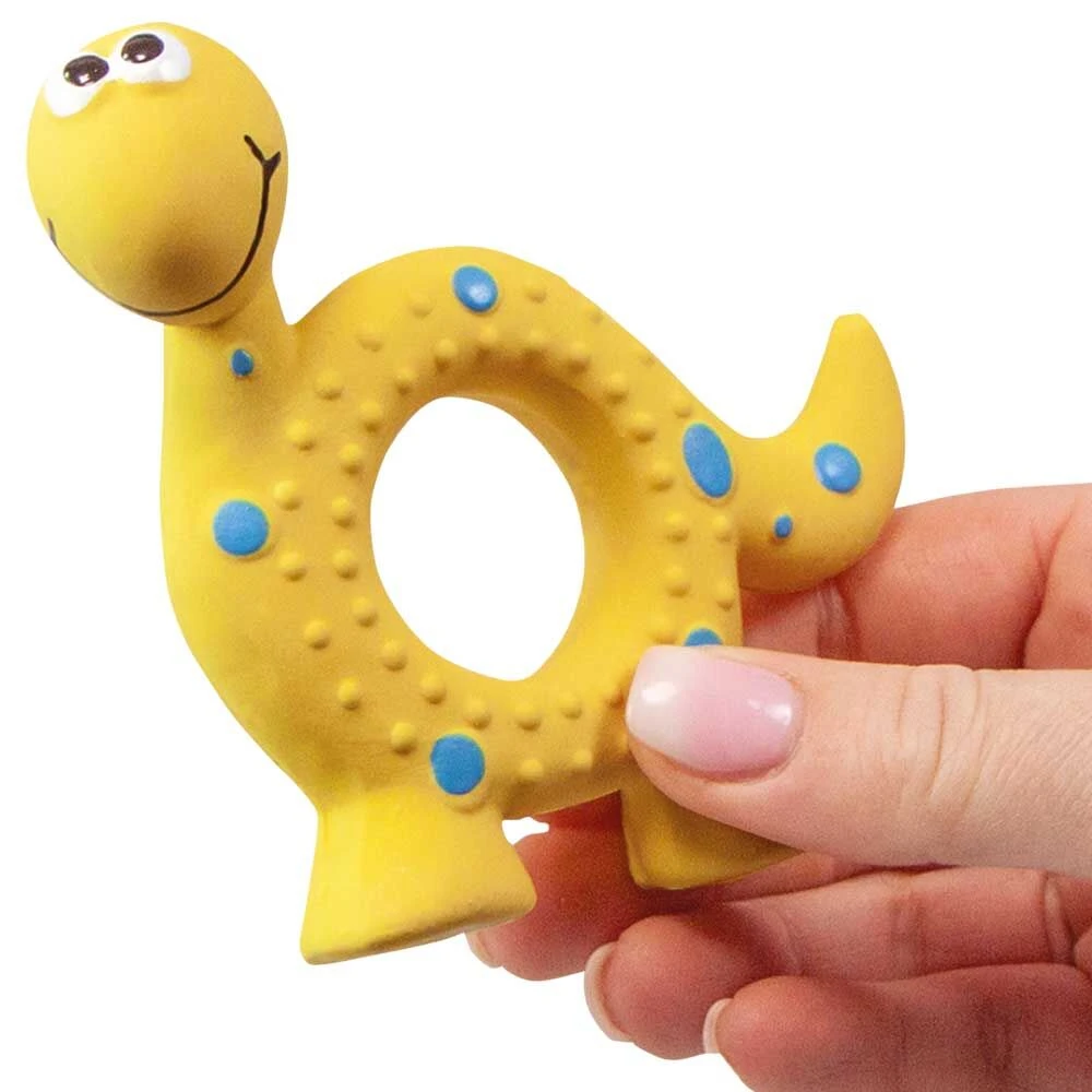 Zacht klein speeltje, geschikt voor pups en kleinere honden. De schattige latexrubber-figuren zijn speciaal voor het vermaak van kleine honden ontwikkeld. Ze hebben een zacht piepgeluidje dat aan de binnenkant zit en zo niet met de tandjes te bereiken is. Extra informatie bij het kiezen: de dino is de zachtste uitvoering van de drie figuren, de giraf is de hardste, maar nog altijd elastisch zacht.
