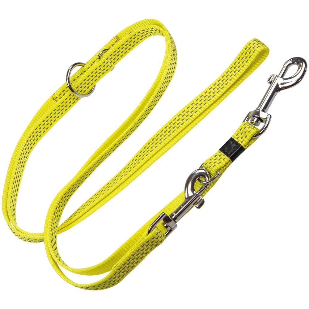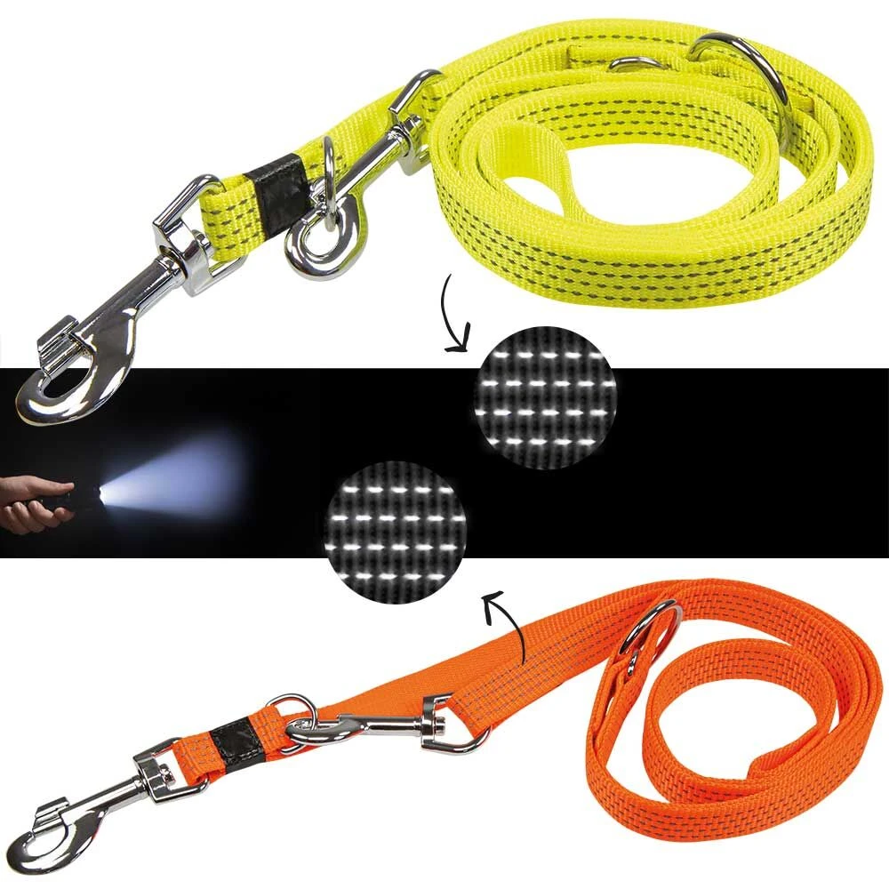 Bijzonder opvallende, solide, drievoudig verstelbare hondenriemen van praktische, hoogwaardige nylon, met stabiele, verchroomd metalen onderdelen.