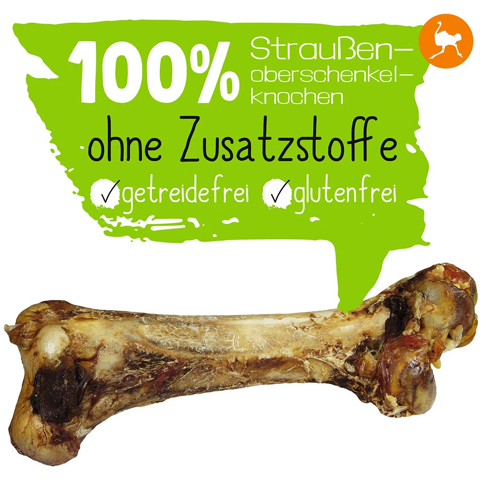 Een echt bot van het bovenbeen van de Afrikaanse struisvogel. Dikke, ca. 30 / 50 cm. lange botten, met hier en daar nog spier en vlees stukjes. Ideaal voor sensibele honden, is alleen maar lang gedroogd en niet gerookt.