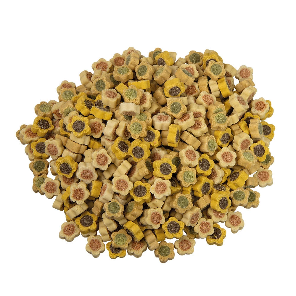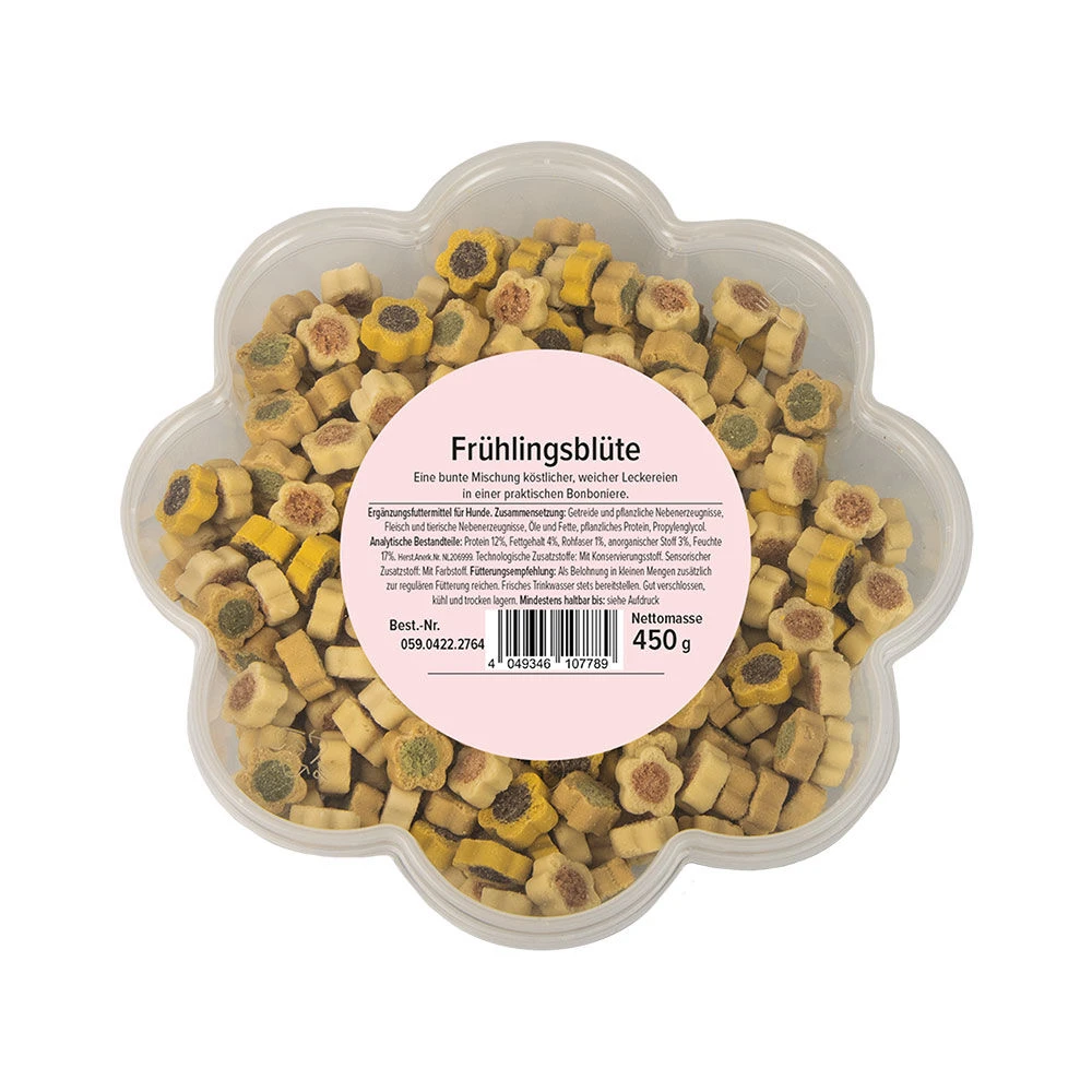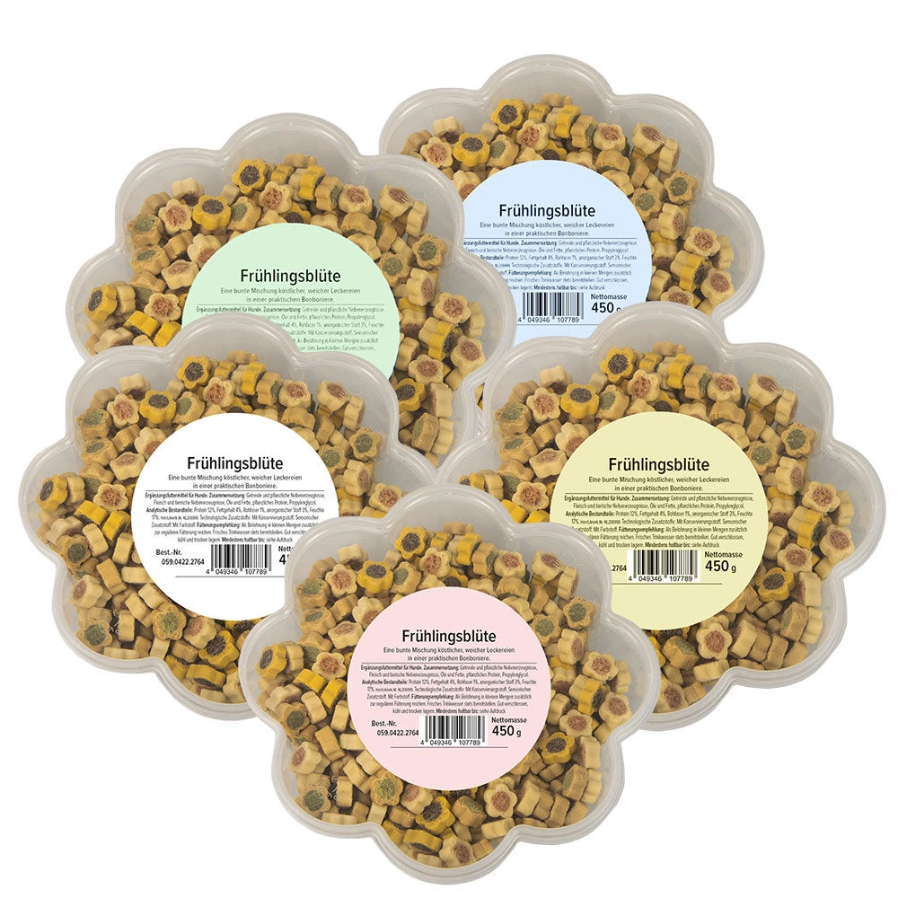 Een kleurrijke mix van heerlijke, zachte lekkernijen in een praktische bonbonière. De bloemen, die slechts 1,5 cm groot zijn, bieden uw hond veel afwisseling. De vele mini-snacks zijn ook ideaal als trainingssnack of beloning. De vetarme snacks zijn caloriearm en elk van de fijne stukjes zorgt dat uw hond zin krijgt in meer. De kleine beloningen zijn leuk voor iedereen
