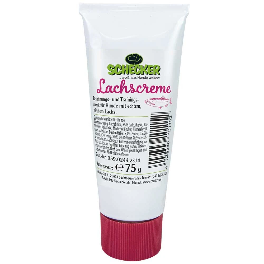 Heerlijk crèmige belonings- en trainingssnack voor honden. Van vers zalmvlees, met raapolie en andere fijne ingrediënten. Helemaal zonder conserveringsmiddelen of andere toevoegingen! Schecker-zalmcrème is de perfecte liksnack voor op het trainingsveld, voor het uitlaten of gewoon voor tussendoor. Een beetje afwisseling voor uw kleine viervoeter en zeer praktisch in gebruik!