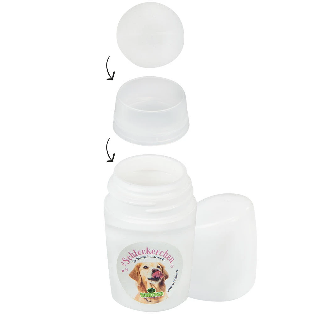 Belangrijke informatie: de roller ‘Schleckerchen’ is geen hondenspeelgoed en mag alleen worden gebruikt voor het aangegeven doel en zoals beschreven. Nooit aan de hond zelf geven! Train langzaam en voorzichtig, totdat de hond veilig heeft geleerd de snack op te likken en er niet meer in probeert te bijten! Ingeslikte onderdelen kunnen tot ernstige gezondheidsproblemen leiden!