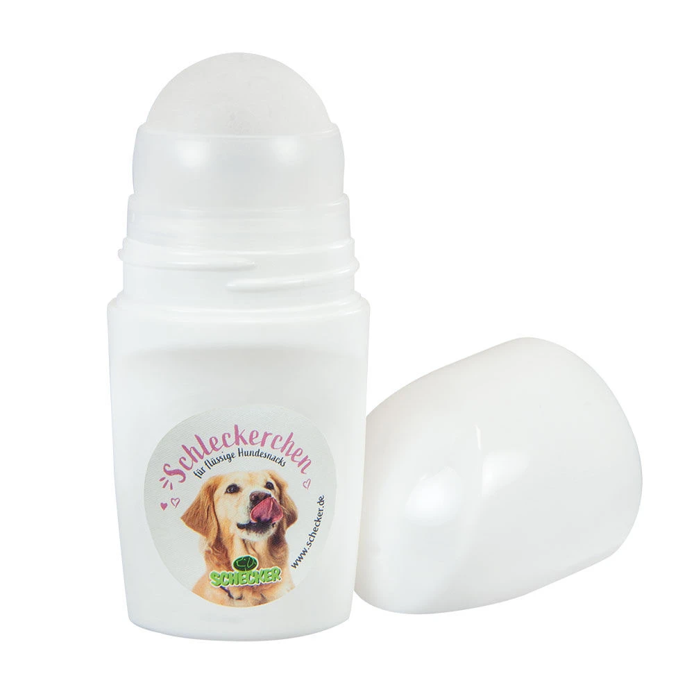 Gebruik: draai de dop eraf. Houd de roller stevig in uw hand (niet knijpen!) en houd het uiteinde met de gevulde bal voorzichtig naar uw hond toe. Let op: voorkom dat de hond in de roller bijt! Uw hond moet eerst leren dat hij niet mag bijten of happen, maar alleen mag likken.