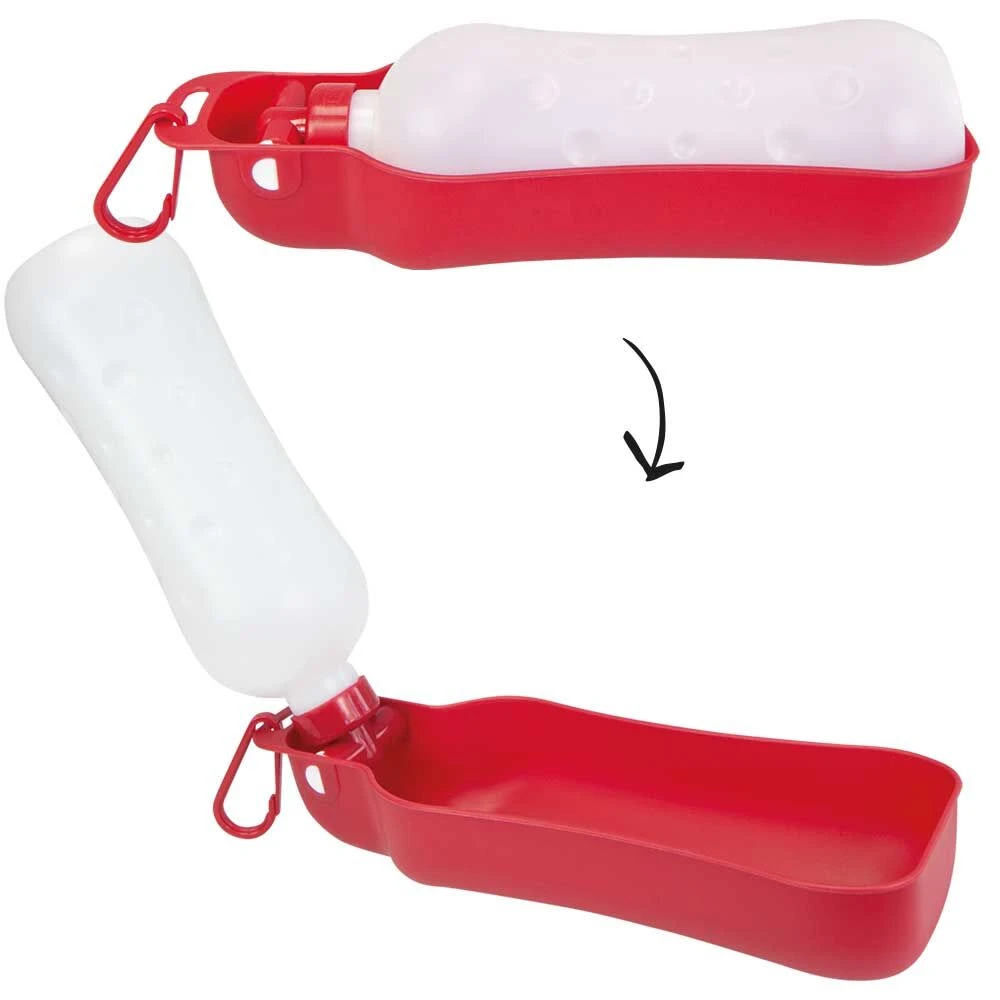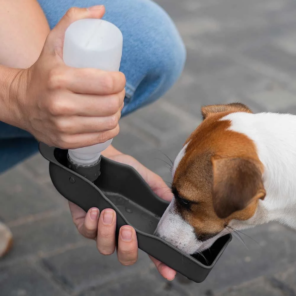 Met deze praktische waterfles zit uw hond ook onderweg altijd op de juiste plek. Deze gepatenteerde oplossing is nl. waterbak en fles in één. De drinkkom wordt gewoon uitgeklapt waarna het water er door een lichte druk in wordt gedaan, zodat uw viervoeter naar hartenlust kan drinken. Vervolgens wordt de drinkkom gewoon weer dichtgeklapt en de handige waterfles is weer lekvrij.