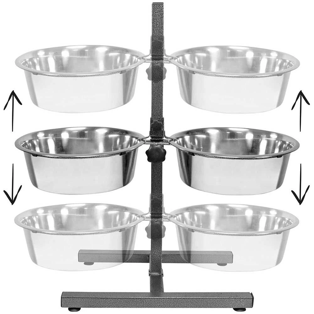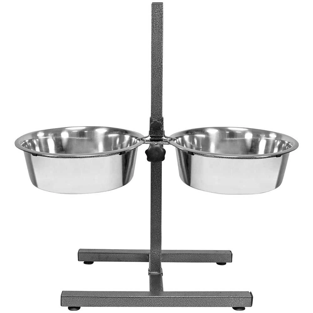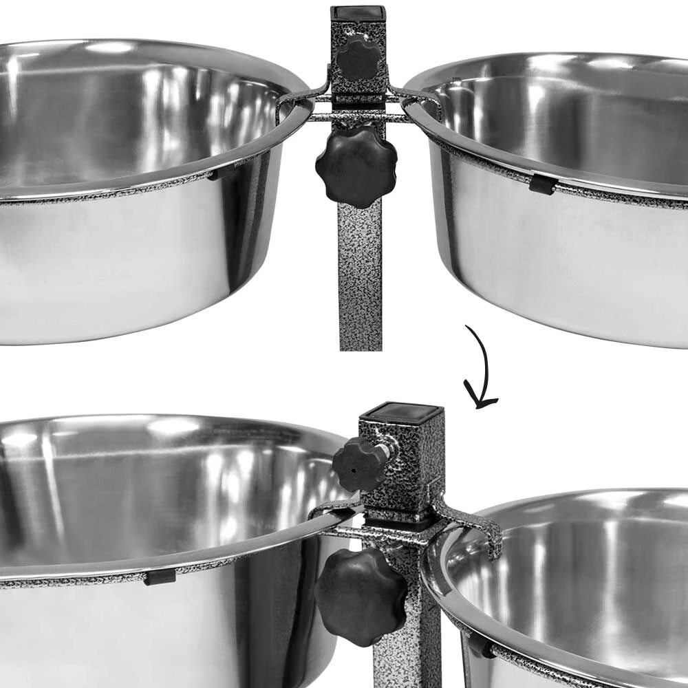 Deze in voerbak is traploos in hoogte verstelbaar van 5 – 60 cm en staat heel stevig op de vloer door het gegalvaniseerde oppervlak van de stalen standaard. De voerbakhouders zijn gemaakt van roestvrij kwaliteitsstaal en voorzien van 2 roestvrije edelstalen voerbakken. Ideaal voor honden die graag op een hoger niveau willen eten en drinken en voor alle grote rassen die op een hoger niveau moeten eten.