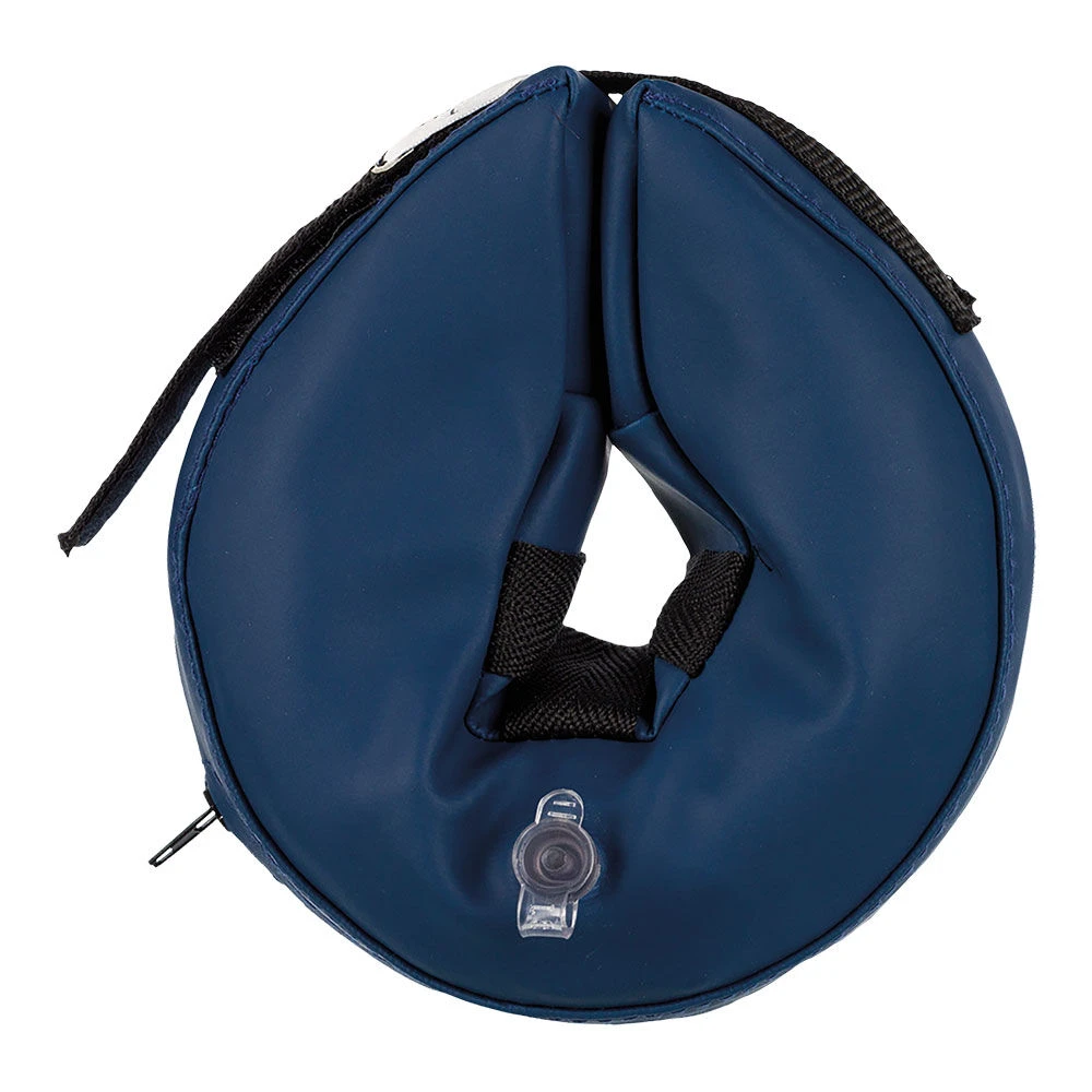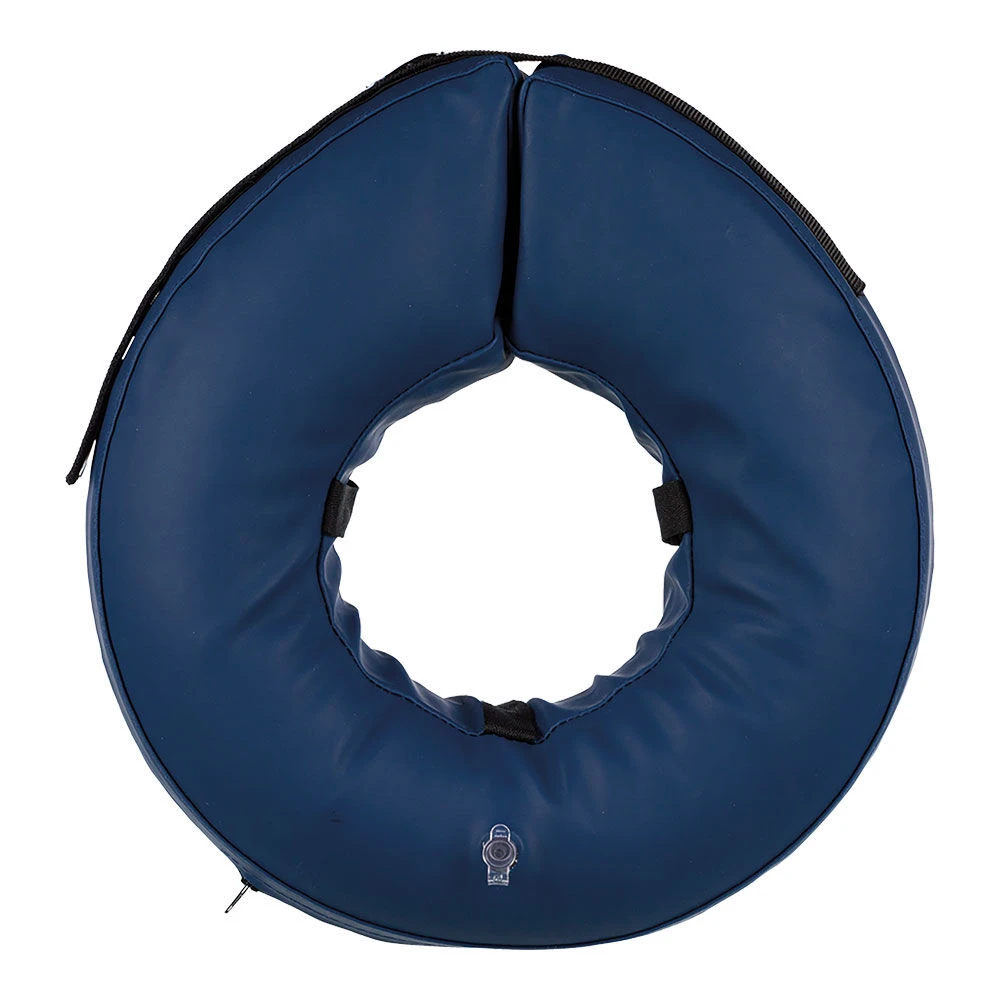 De opblaasbare hondenkraag heeft een geïntegreerd veiligheidsventiel. Om de kraag op te blazen en leeg te laten lopen, moet het ventiel aan de onderkant (in het onderste gedeelte, verborgen door de hoes) zeer hard worden samengeknepen. Het ventiel is alleen open zolang deze samengeknepen is. (Net als bij zwembandjes en veel luchtbedden!) Tip: bij het opblazen kunt u dit het gemakkelijkst doen door er met uw snijtanden in te bijten als u erin blaast. Knijp gewoon uw vingers samen om er lucht uit te laten. Gebruik van een pomp is niet nodig.