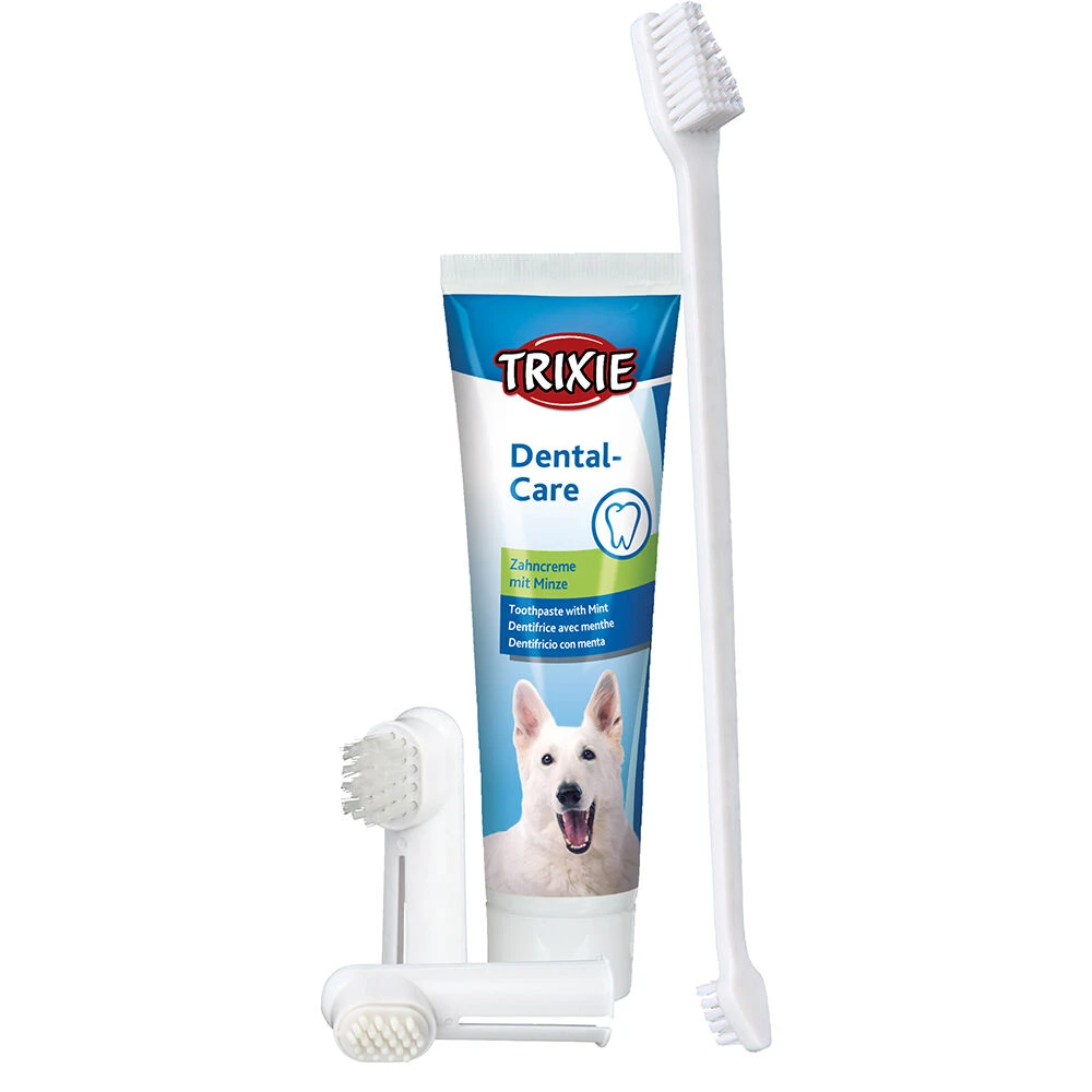 Eindelijk een set die alles bevat wat u voor de gebitsverzorging van uw lievelingsdier nodig heeft: tandpasta met munt, die zorgt voor een frisse adem en de tanden van uw hond reinigt, twee vingertandenborstels, één voor het masseren van het tandvlees en één voor het poetsen van de ruimten tussen de tanden, een dubbele tandenborstel met een kleine opzetborstel voor de kiezen en een grote opzetborstel voor de voortanden.