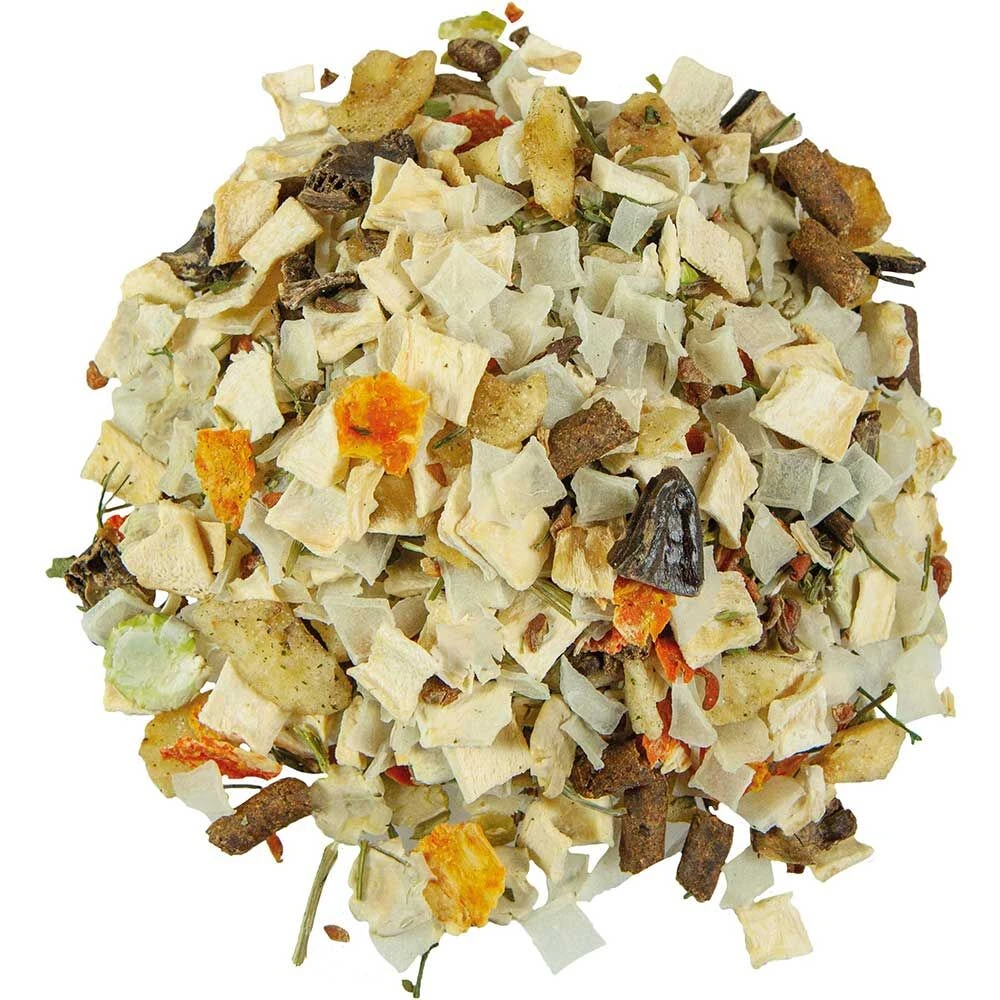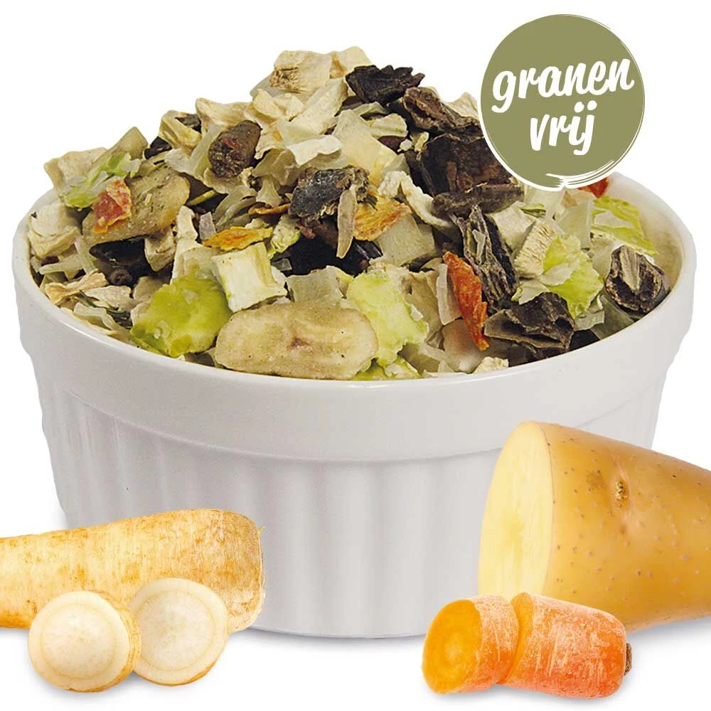 Granenvrije, glutenvrije muesli op basis van fruit en groente. Met aardappelen, peterselie, pastinaken, erwten en wortels. Met een beetje johannesbrood voor een lekkere chocoladesmaak. Ideaal om bij vers vlees te geven. Simpelweg met water mengen en toevoegen aan de reguliere maaltijd van vers vlees of blikvoer (tot 40%).