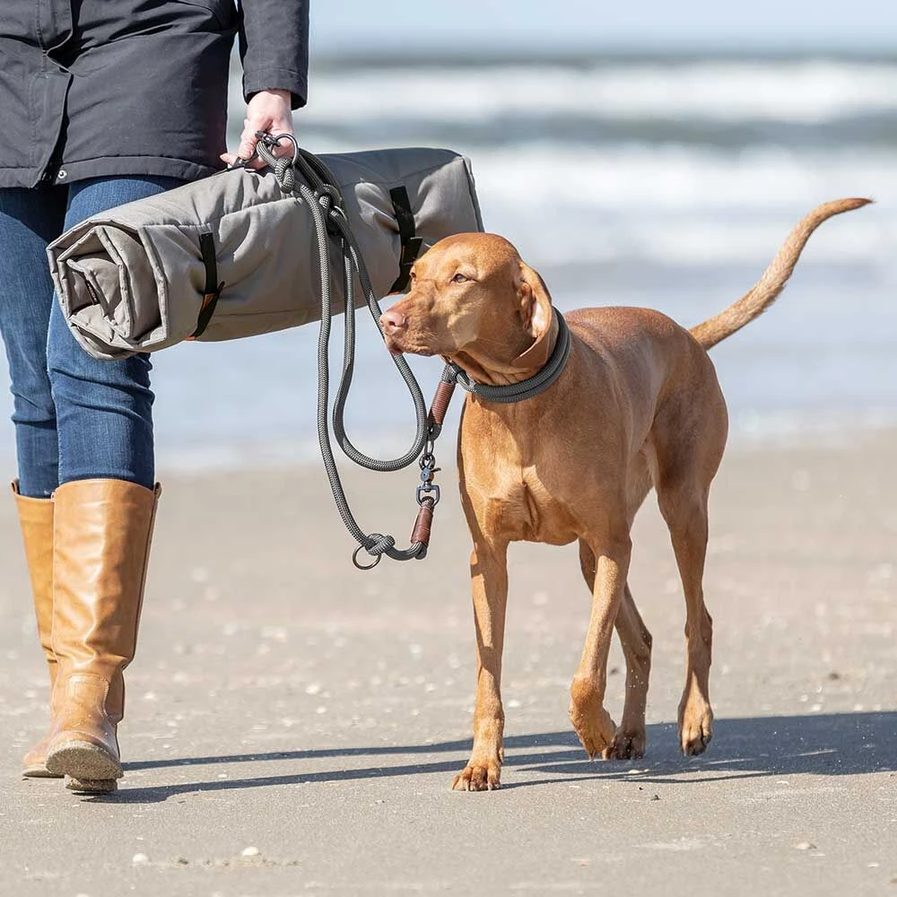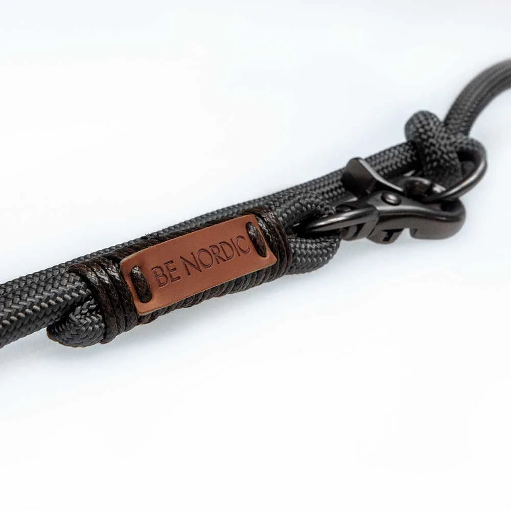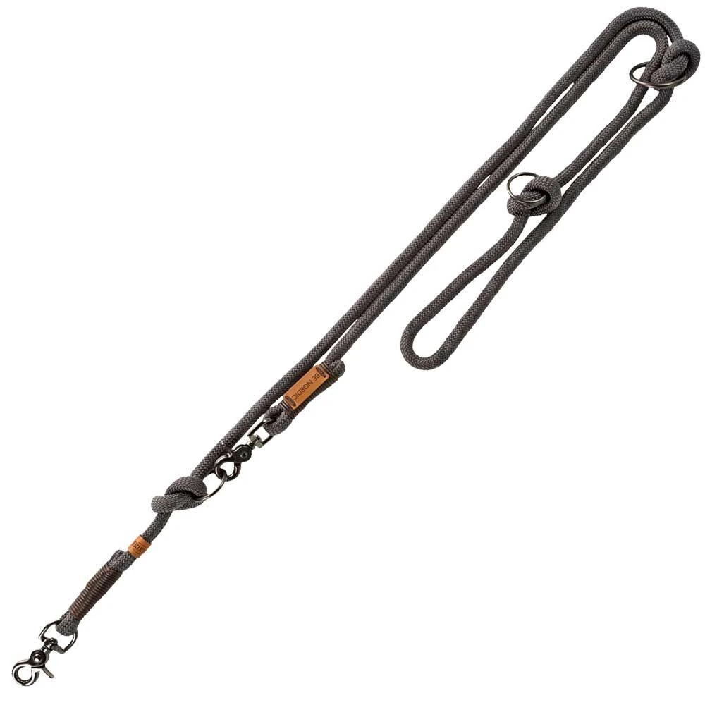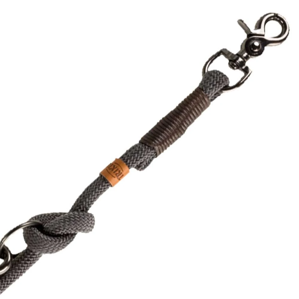 Drievoudig verstelbare (traploos door verzetten van de knoop) hondenriem met karabijnhaak (ook als er hard aan de lijn getrokken wordt, is losmaken eenvoudig.)
