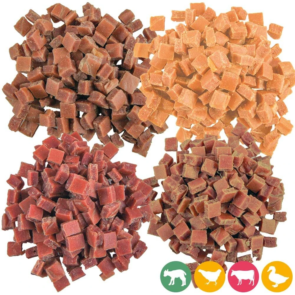 Een set van 4 verschillende, zachte mini-vleesbrokjes (lam, kip, rund, eend), afzonderlijk verpakt. Ideaal voor de (clicker)training of gewoon voor tussendoor. Van bijna 90% vlees met iets glutenvrije aardappel en erwten, maar zonder toevoeging van suiker. Het toppunt van variatie!