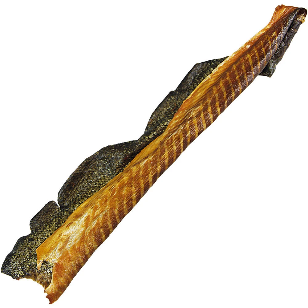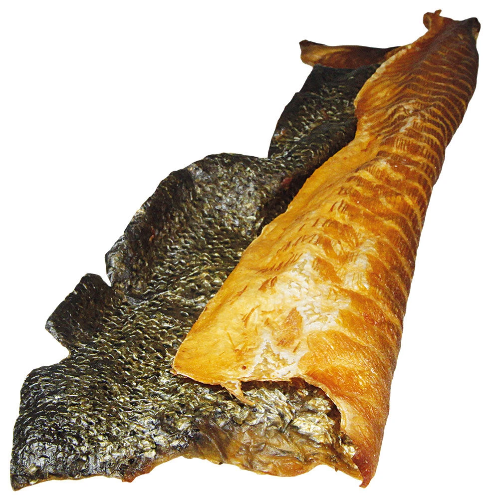 Grote, met de schaar naar wens op maat te knippen stukken huid van gerookte zalm, met vleesaanzet. Met een heerlijke geur en bevochtigd met natuurlijke zalmolie. Per verpakking 1 huidkant van de zalm, afhankelijk van de hoeveelheid vlees ca. 180-220 g zwaar, tot 60 cm lang.